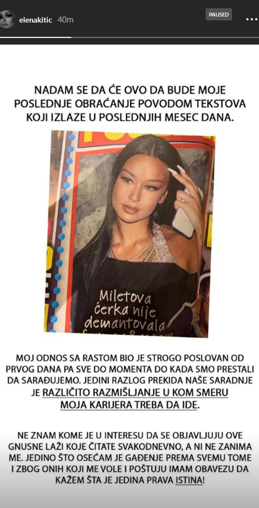 - Nadam se da će ovo da bude moje poslednje obraćanje povodom tekstova koji izlaze u poslednjih mesec dana. Moj odnos sa Rastom bio je strogo poslovan od prvog dana, pa sve do momenta do kada smo prestali da sarađujemo. Jedini razlog prekida naše saradnje je različito razmišljanje u kom smeru moja karijera treba da ide. Ne znam kome je u interesu da se objavljuju ove gnusne laži koje čitate svakodnevno, a ni ne zanima me. Jedino što osećam je gađenje prema svemu tome i zbog onih koji me vole i poštuju imam obavezu da kažem da je ovo jedina prava istina.