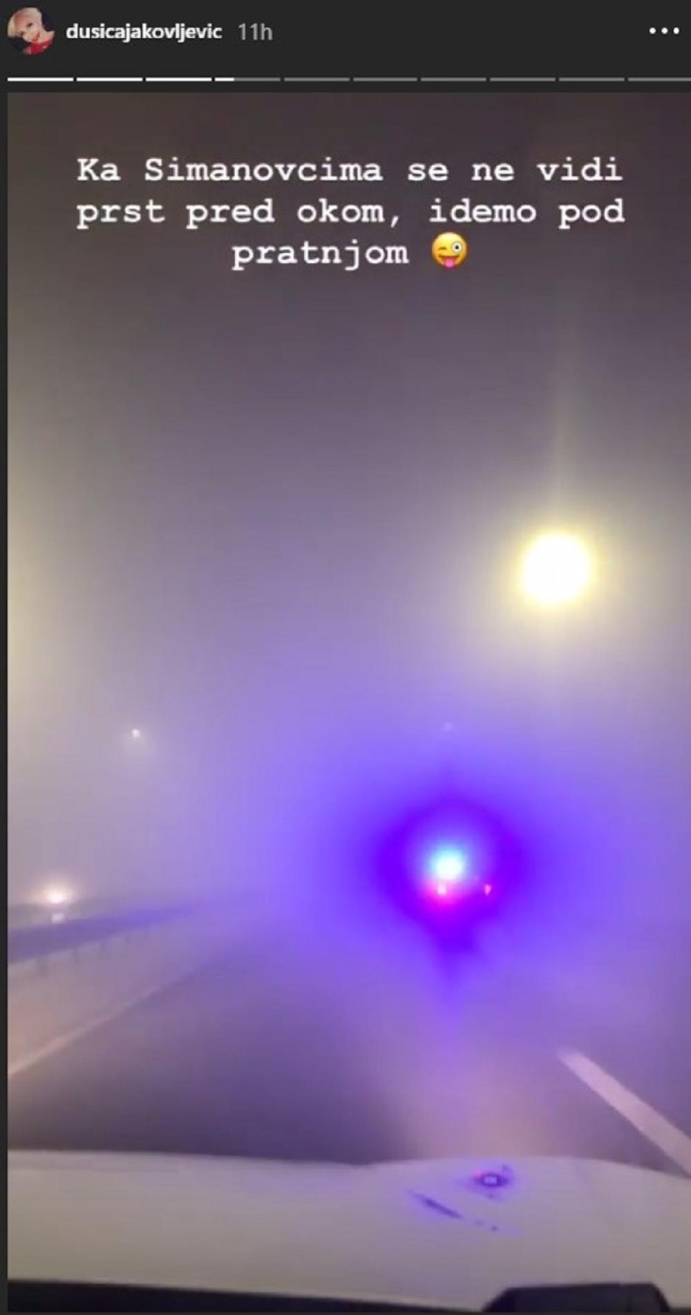 Naime, zbog guste magle njen automobil u kom se kretala put Šimanovaca jedva se probijao. Dok se voditeljka vozila ka studiju, ispred nje je bio automobil s rotacijom, te se Dušica našalila napisavši: