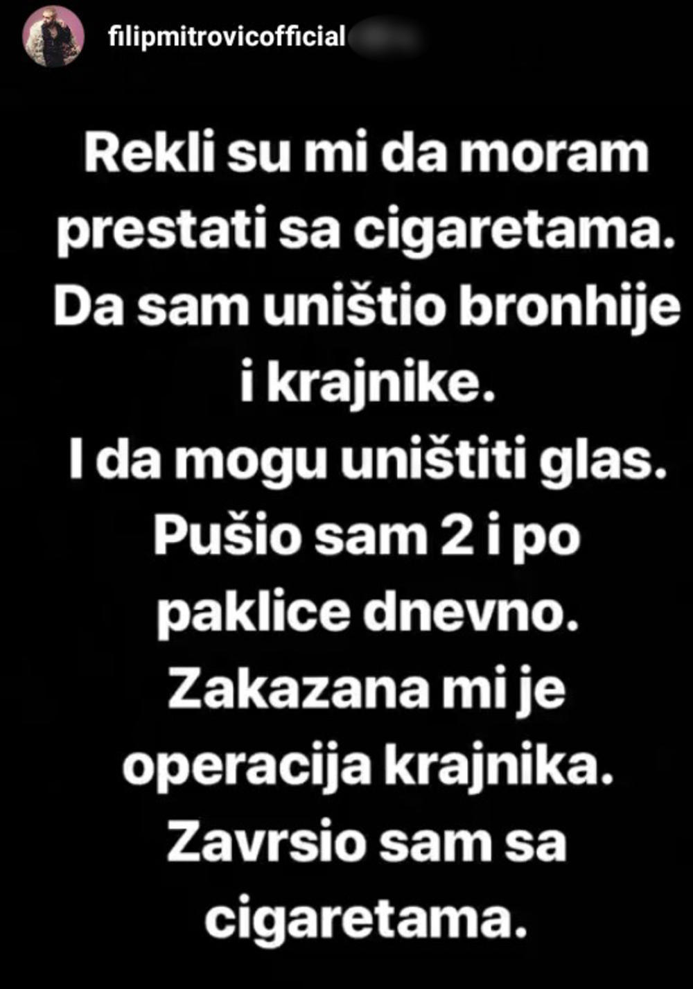 "Rekli su da moram prestati sa cigaretama. Da sam uništio bronhije i krajnike. I da mogu uništiti glas. Pušio sam dve i po paklice dnevno. Zakazana mi je operacija krajnika. Završio sam sa cigaretama", poručio je Filip na svom Instagramu.