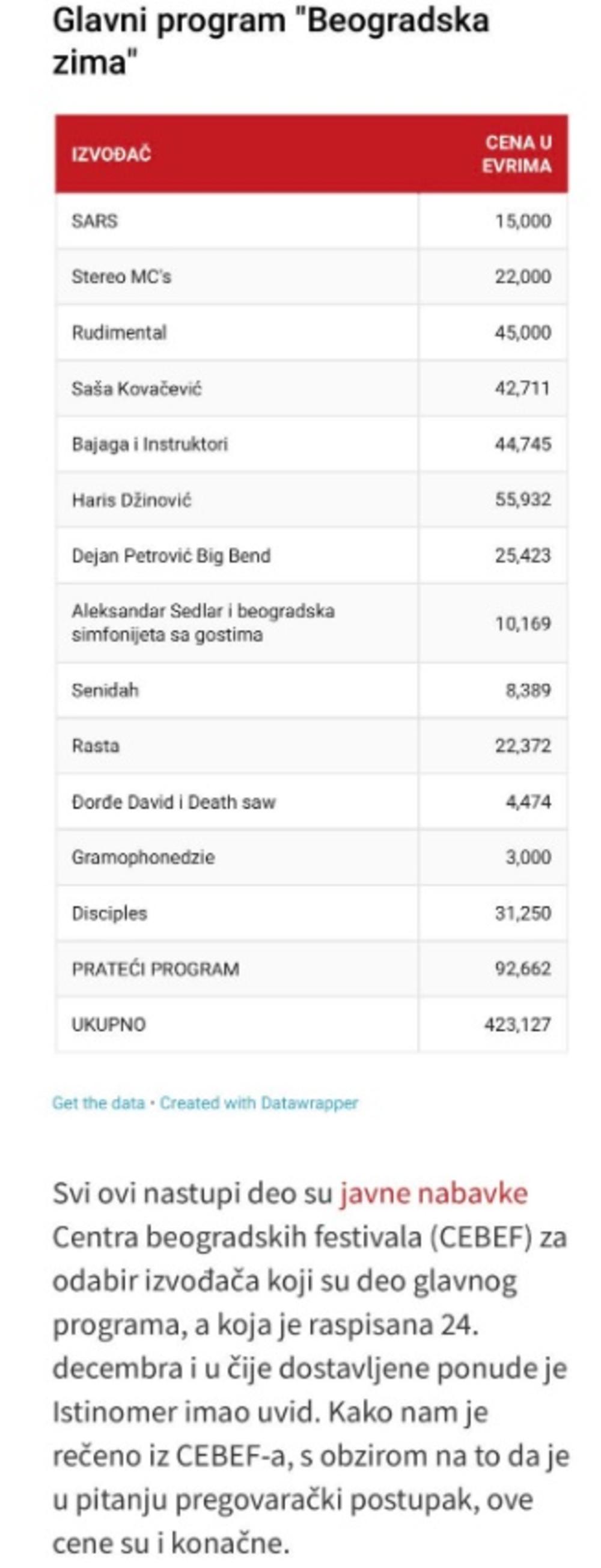 Dakle: SARS 15 hiljada evra, i Aleksandar Sedlar sa gostima sa 10, u odnosu na ove neke ostale i ne bi mogli da se pohvale baš nekom strmoglavom cifrom. Tako da smo tu uštedeli. Na njih ukupno ide tek jedna garsonjerica. Ali tu je zato Rudimental sa honorarom od 45 hiljada. I to je u redu - ipak su to stranci, jest' da drum n' base u Srbiji sluša najmanji procenat ljudi, ali eto, sada imaju idealnu priliku da ga zavole. A i bitno da je ritmično i veselo. Kad se ponapijamo ko što umemo po Trgovima - who cares, uostalom?! Tu je naravno i Bajaga, za sve one koji nisu bili u Areni, mogu da dođu na ovu povoljniju varijantu, i to bez da im karta uopšte i treba... a i nema nikakvih spiskova... može da dođe ko god hoće. I ako nas pitate treba iskoristiti tu jedinstvenu priliku, jer ipak se neko baš fino otvorio da nam svima udovolji. Baš bi bilo glupo da propadne tih 44.745 evra. To bi bilo čisto bahaćenje.