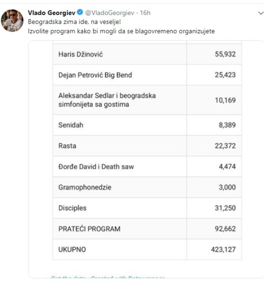 Elem, pevač Vlado Georgiev objavio na svom tviteru pomenut spisak, koji ćemo mi nesebično podeliti sa vama, da kao što i on reče - imate dovoljno vremena da se lepo organizujete. A i tu sve lepo piše šta kome i na šta koliko hiljada evra...da se zna odakle ta krajnja cifra od pola miliona...prosto da ne mislite da vas neko zavlači. Evo ima, sve crno na belo.