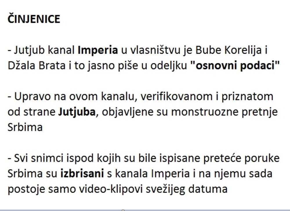 U ovoj njegovoj izjavi sporna je tvrdnja da su pretnje Srbima ubistvom i klanjem napisane s lažnog profila, s ciljem da se naudi njihovoj karijeri i popularnosti u našoj zemlji. Jutjub kanal Imperia u vlasništvu je Bube Korelija i Džala Brata i to jasno piše u odeljku "osnovni podaci", gde je takođe navedeno da su posao s tom društvenom mrežom pokrenuli još 2006. godine. Upravo na ovom kanalu, verifikovanom i priznatom od strane Jutjuba, objavljene su monstruozne pretnje sledeće sadržine: "Lajk ako bi i ti klao Srbe" i "Mafijašu, je*o te otac srpski, čitav život samo go*na jedete. Sve su Srbe vešali na vrbe."