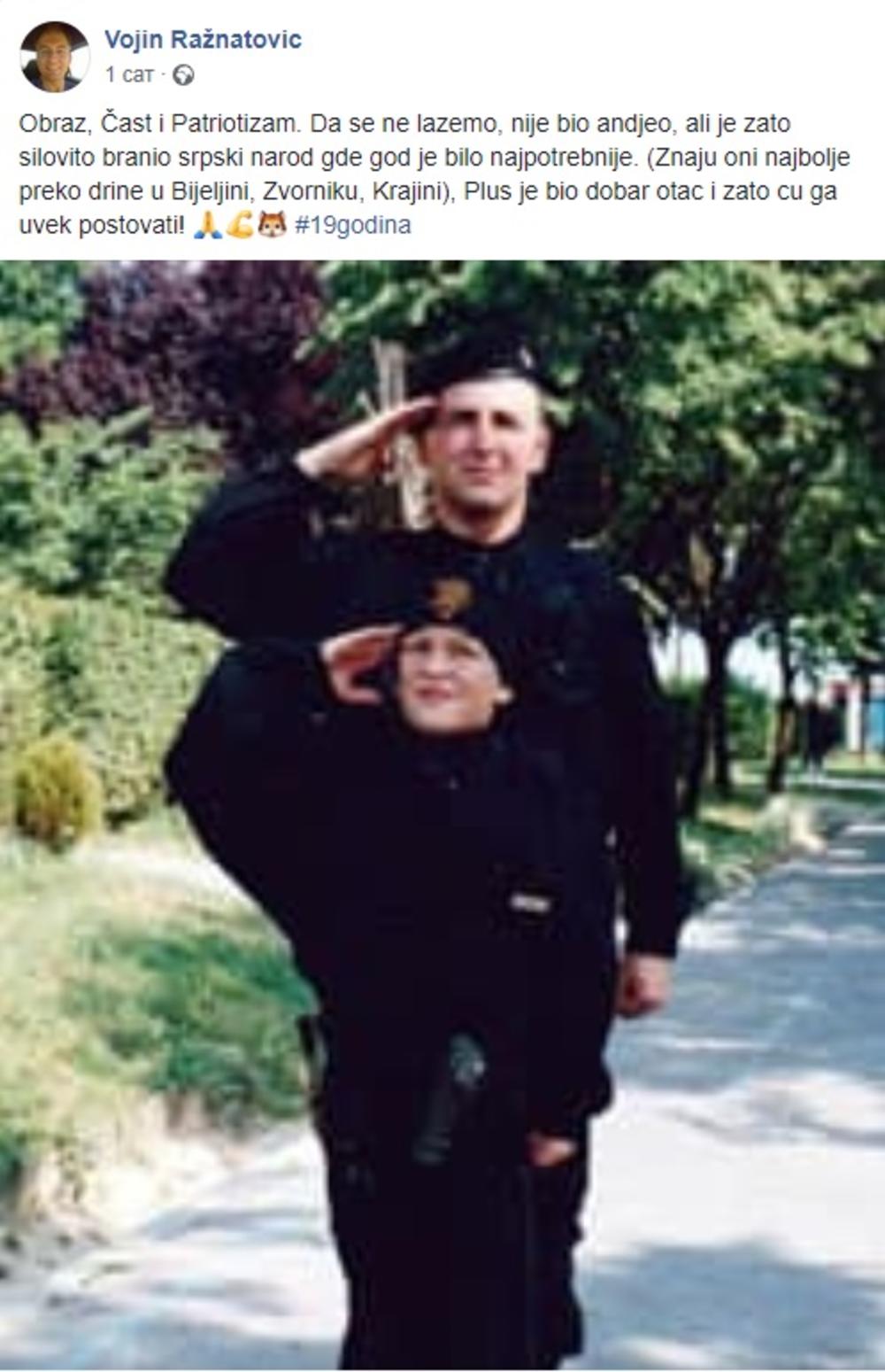 - Obraz, čast i patriotizam. Da se ne lažemo, nije bio anđeo, ali je zato silovito branio srpski narod gde god je bilo najpotrebnije. (Znaju oni najbolje preko Drine u Bijeljini, Zvorniku, Krajini). Plus je bio dobar otac i zato ću ga uvek poštovati! 19 godina - napisao je on.