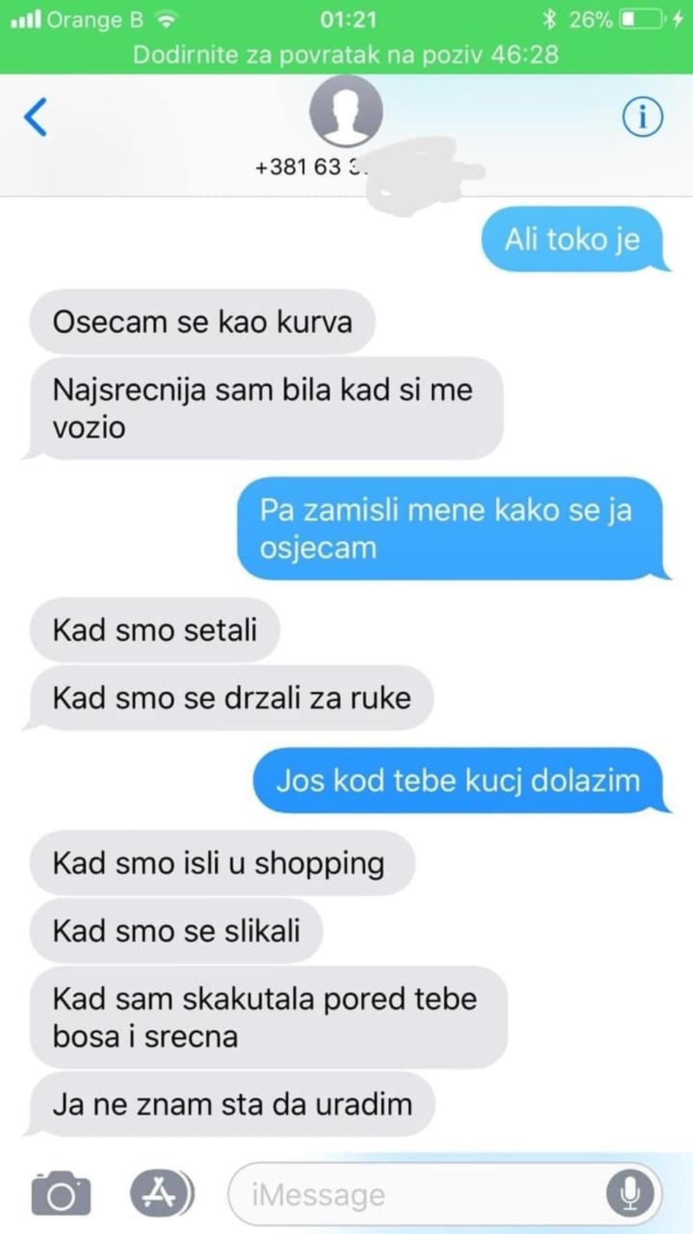 - Osećam se kao ku*va. Najsrećnija sam bila kada si me vozio. Kad smo se šetali, kada smo se držali za ruke. Kad smo išli u šoping, kad smo se slikali, kad sam skakutala pored tebe bosa i srećna. Ja ne znam šta da radim - napisala mu je Karleuša, a on joj je rekao da se oseća loše zato što imaju seks u njenoj porodičnoj kući.
