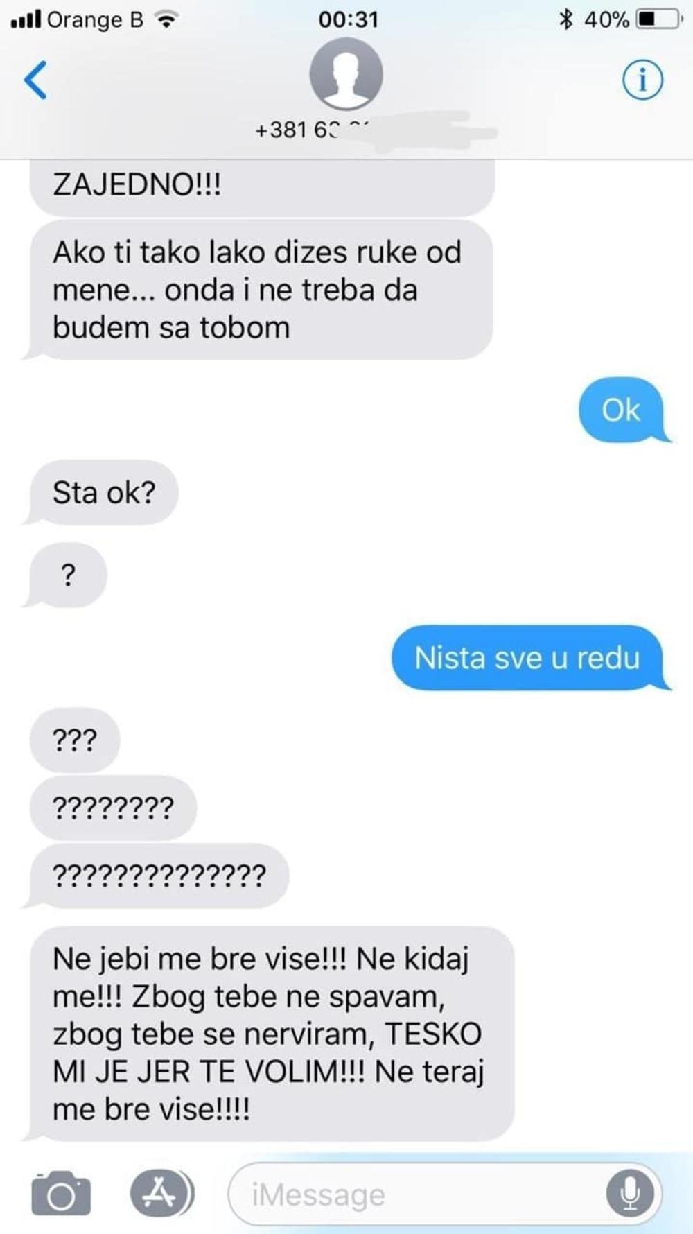 JK: Ne je*i me, bre, više! Ne kidaj me! Zbog tebe ne spavam, zbog tebe se nerviram, teško mi je jer te volim! NE teraj me, bre, više!