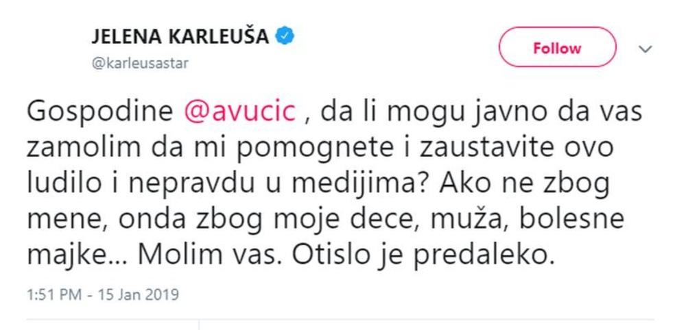 - Gospodine Aleksandre Vučiću, da li mogu javno da vas zamolim da mi pomognete i zaustavite ovo ludilo i nepravdu u medijima? Ako ne zbog mene, onda zbog moje dece, muža, bolesne majke... Molim vas. Otišlo je predaleko - poručila je Karleuša.