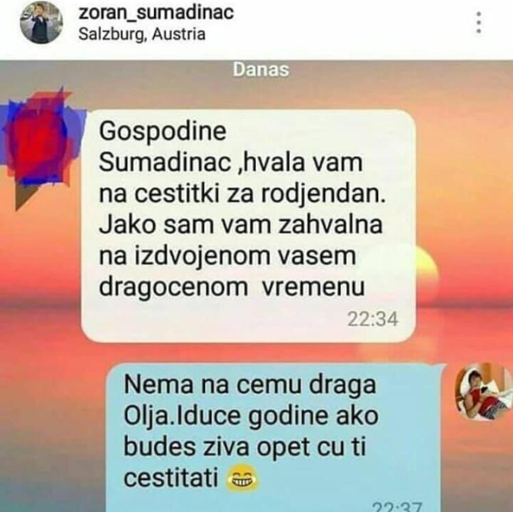 - Nema na čemu draga Olja. Iduće godine ako budeš živa opet ću ti čestitati - napisao je Zoki, a s obzirom da se bavi i astrologijom, žena možda zaista treba da se zabrine...