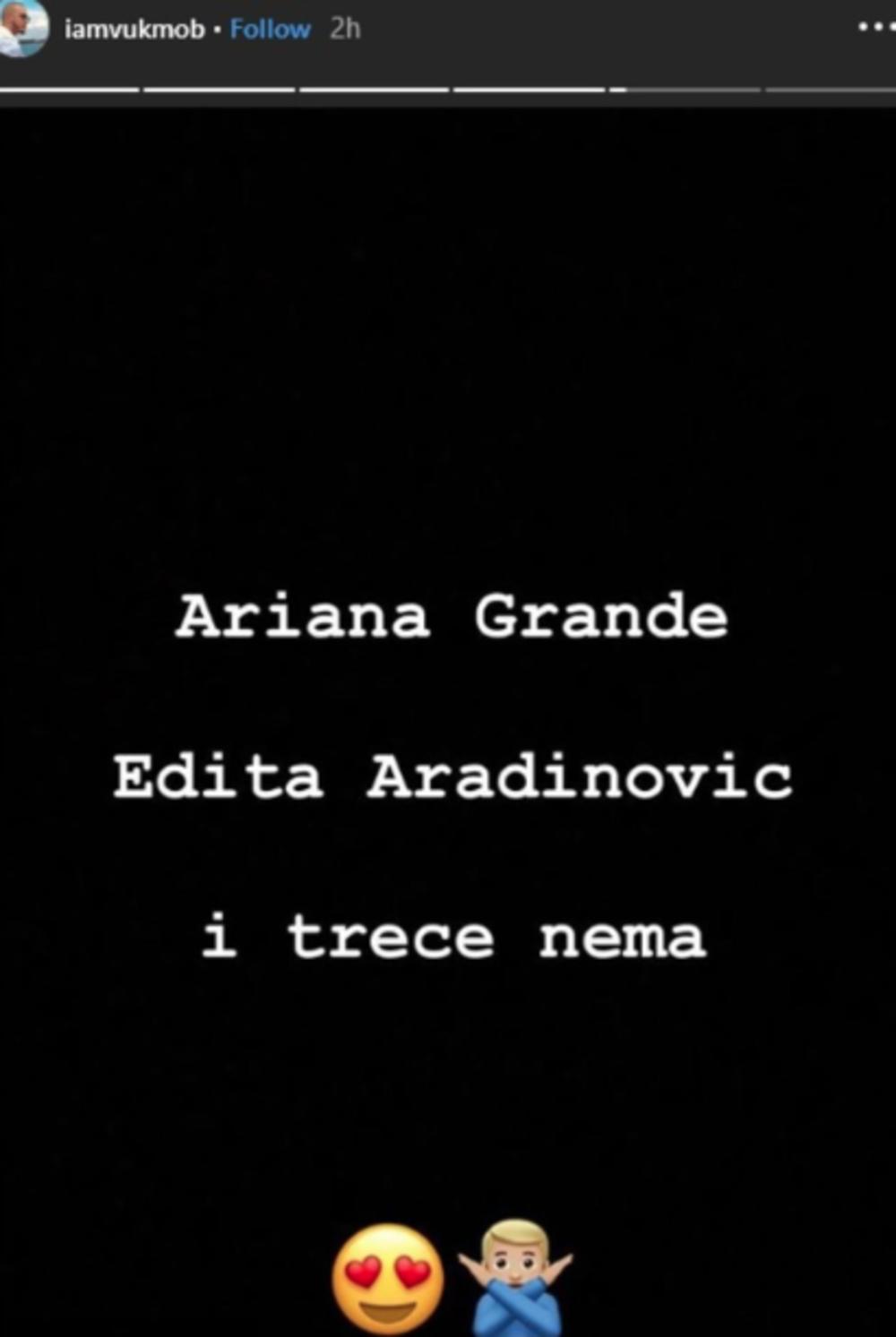 Vuk je međutim na instagramu objavio poruku, koja je mnoge navela da pomisle da je on bacio oko na njihovu koleginicu Editu Aradinović. - Ariana Grande, Edita Aradinović i treće nema - napisao je reper na Instagram storiju, uz smajlić sa srcima u očima, aludirajući na to da gaji simpatije prema atraktivnoj pevačici.