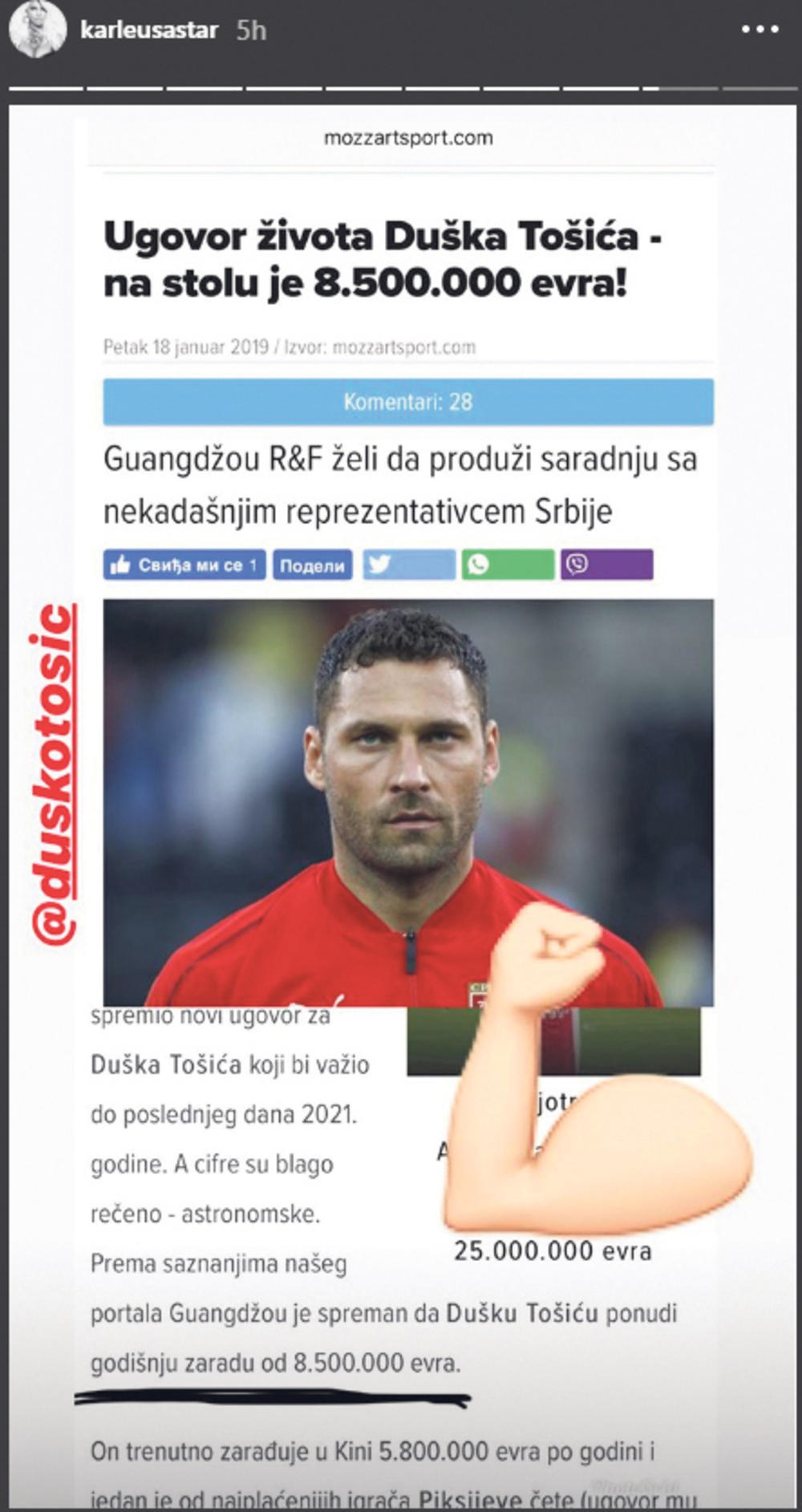 U jeku porno-skandala čiji je glavni akter, Karleuša je počela da se hvali time da njen suprug Duško Tošić zarađuje milione. Dok javnost bruji o njenom navodnom neverstvu i tome da je slala gole slike fudbaleru Ognjenu Vranješu, ona očito na sve načine pokušava da demantuje govorkanja da je razvod na pomolu. Prvo je na Instagram storiju objavila nekoliko slika sa suprugom, nastalih prošle nedelje u Kini, a zatim i fotografiju na kojoj piše naslov „Ugovor života Duška Tošića - na stolu je 8.500.000 evra“. Ovo se odnosi na tekst koji je objavljen u medijima da će fudbaler produžiti ugovor s klubom Guangdžou RF i da će na godišnjem nivou zarađivati znatno više od doskorašnjih 5,8 miliona po sezoni.