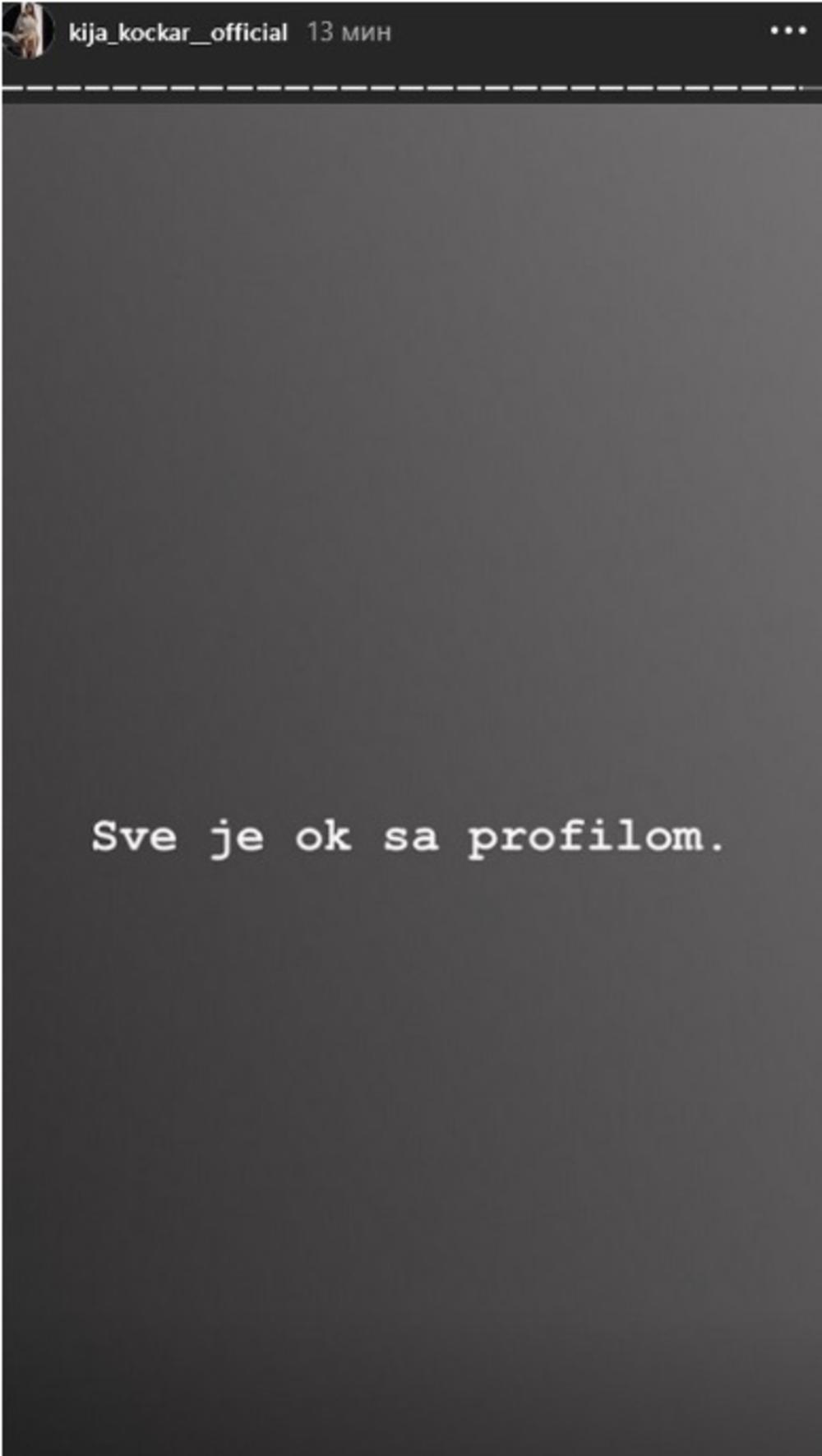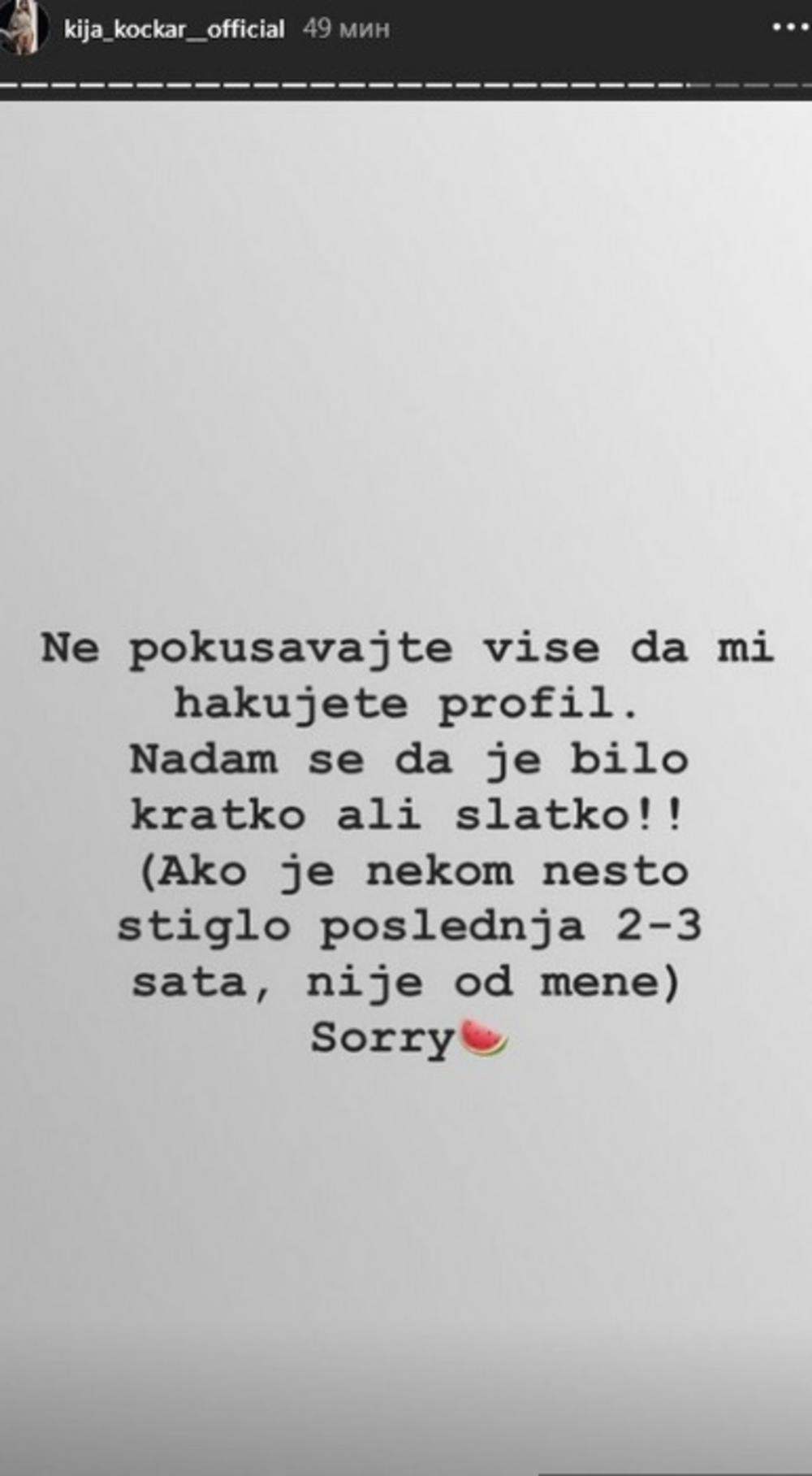 - Ne pokušavajte više da mi hakujete profil. Nadam se da je bilo kratko, ali slatko. Ako je nekome nešto stiglo poslednja 2-3 sata nije od mene. Izvinite - poručila je Kija.