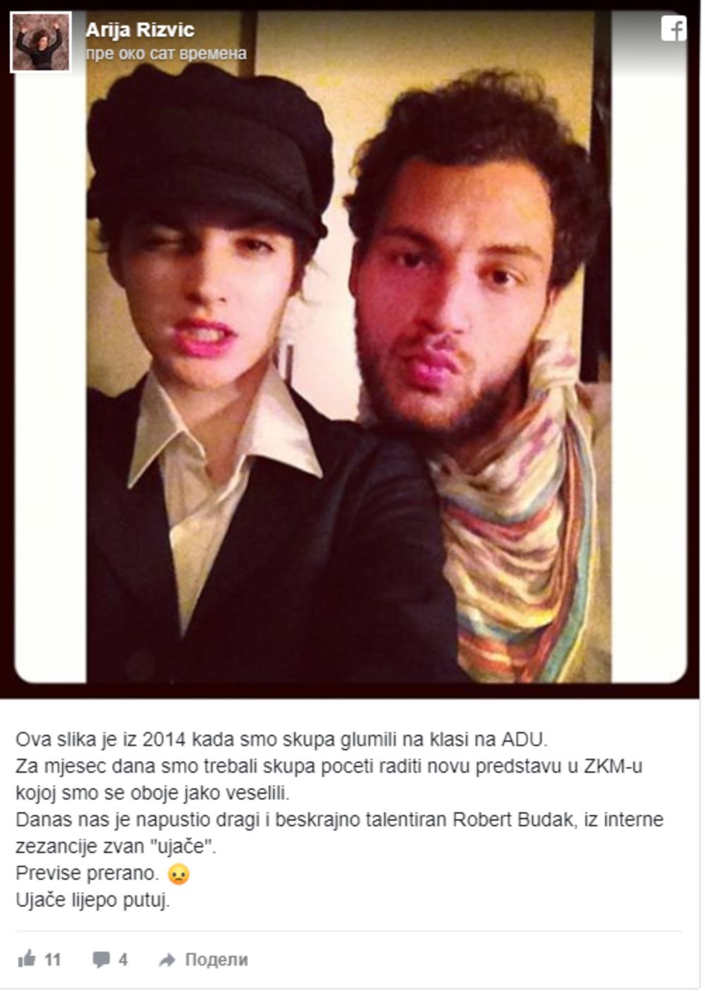 "Ova fotografija je iz 2014. kada smo skupa glumili na klasi na ADU. Za mjesec dana smo trebali skupa početi raditi novu predstavu u ZKM-u kojoj smo se oboje jako veselili. Danas nas je napustio dragi i beskrajno talentiran Robert Budak, iz interne zezancije zvan 'ujače'. Previše prerano. Ujače lijepo putuj", napisala je na društvenim mrežama Robertova kolegica Arija Rizvić.