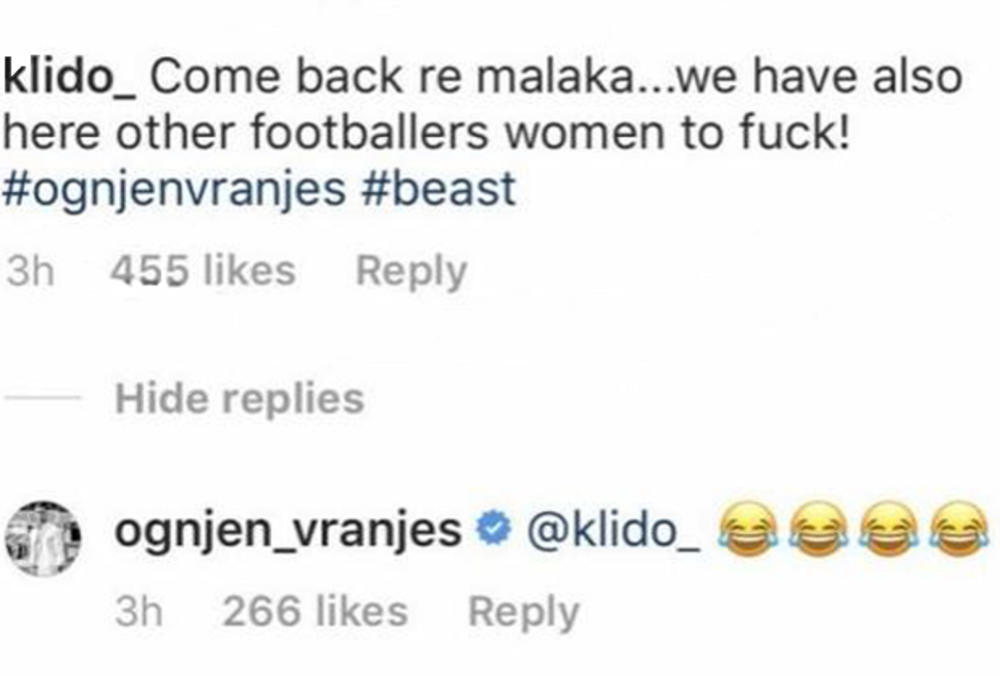 "Vrati se. I mi ovde imamo mnogo žena fudbalera za je*anje", napisao je navijač, a onda je Vranješ odgovorio emotikonima smajlija uplakanog od smeha.