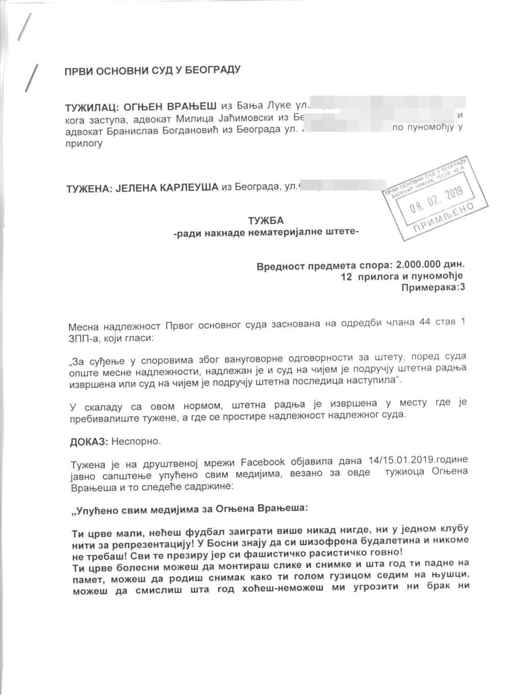 Vranješ je u petak po podne podneo dve privatne tužbe Prvom osnovnom sudu, kao i krivičnu prijavu Višem javnom tužilaštvu zbog pretnji i uvreda koje mu je uputila pevačica preko društvenih mreža. Vrednost sudskog spora, odnosno novčano potraživanje na ime Vranješovog pretrpljenog duševnog bola, iznosi dva miliona dinara, a sud će u procesu odlučiti o visini odštete.