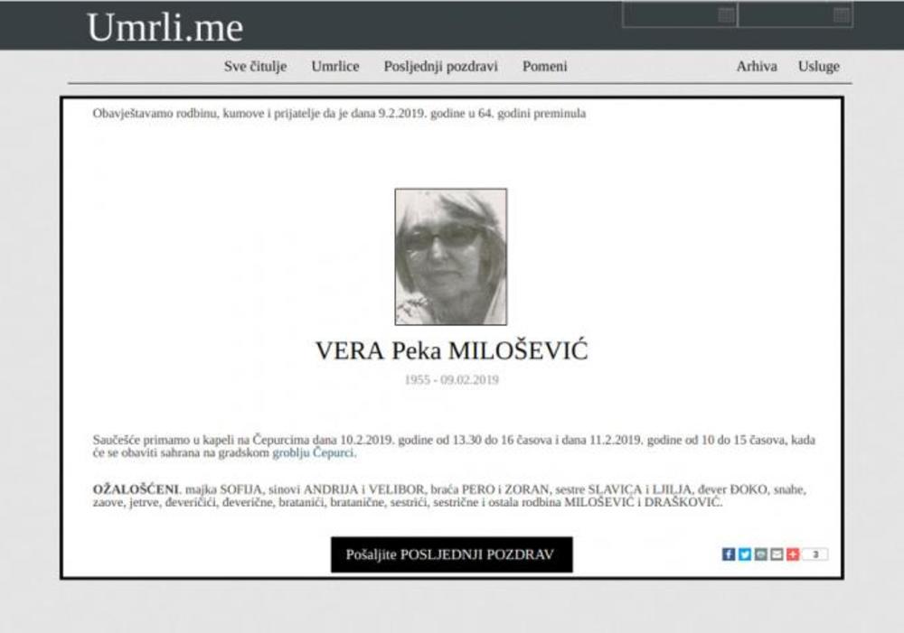 Majka glumca Andrije Miloševića, Vera Milošević, preminula je pre dva dana u 64. godini života u Podgorici. Porodica je odlučila da je sahrani na gradskom groblju "Čepurci", a okačila je i umrlicu u kojoj je obavestila prijatelje i rodbinu o tugi koja ih je zadesila.