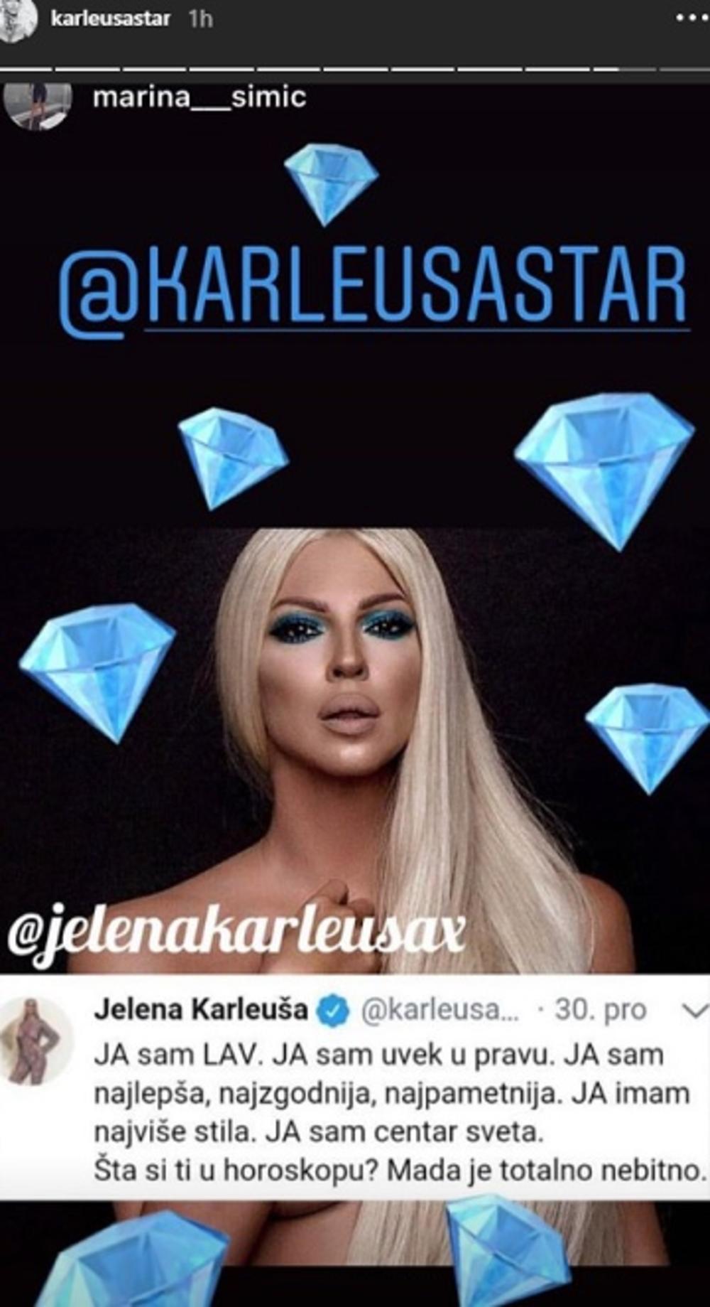 "Ja sam lav. Ja sam uvek u pravu. Ja sam najlepša, najzgodnija, najpametnija. Ja imam najviše stila. Ja sam centar sveta. Šta si ti u horoskopu? Mada je totalno nebitno...", reči su koje je Karleuša objavila uz propratnu fotografiju. Eh, kao da to već sve nismo znali... ili je možda ovog puta htela da i ona u to poveruje, pa joj je bilo lakše ako sve to zapiše.