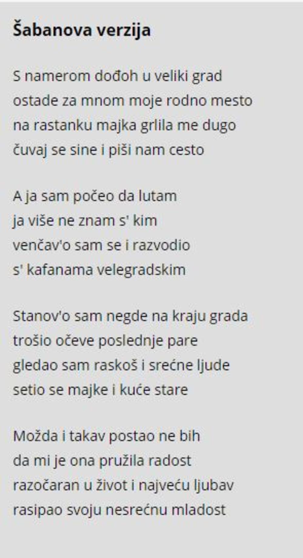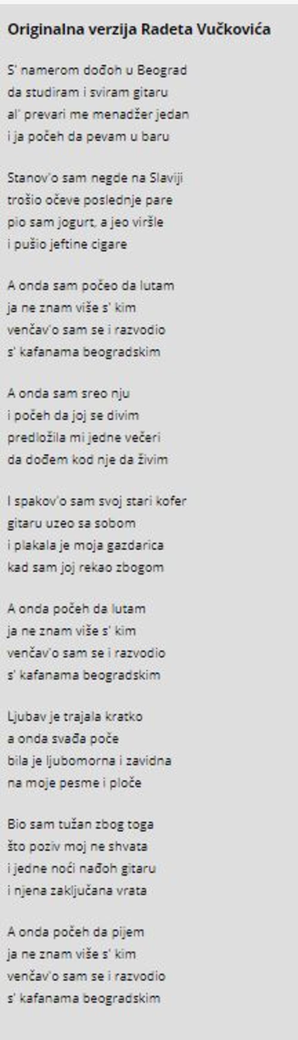 Štaviše, Baja je, promukao, na kraju jednog svog višesatnog nastupa u Republici Srpskoj, pesmu otpevao bliže originalu koji je napisao Rade Vučković, ali je i sam blago pesnički modifikovao origalnu verziju.