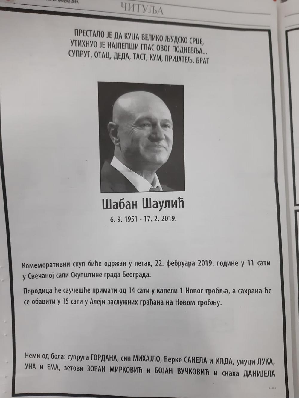 Posebnu čitulju dala su deča Šabana Šaulića, sin Mihajlo i ćerke Ilda i Sanela.