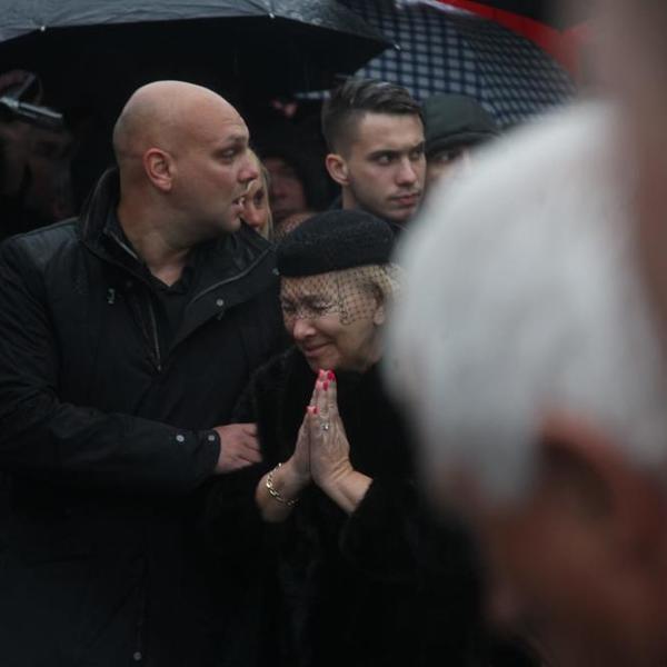 Mina Kostić srušila se na kolena pred kovčegom Šabana Šaulića. Ništa nije supela da izusti, samo je plakala i jecala, te se držala za glavu.