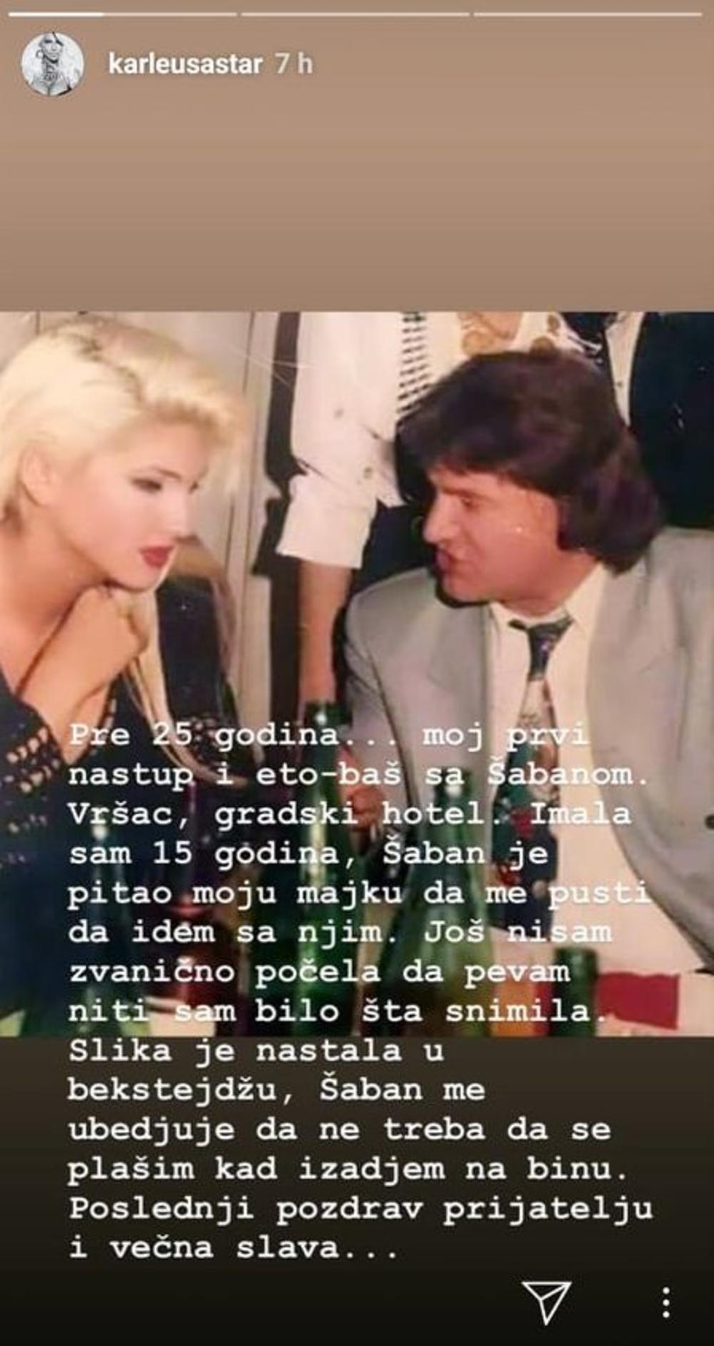 "Pre 25 godina... moj prvi nastup i eto - baš sa Šabanom. Vršac, gradski hotel. Imala sam 15 godina, Šaban je pitao moju majku da me pusti da idem sa njim. Još nisam zvanično počela da pevam niti sam bilo šta snimila. Slika je nastala u bekstejdžu, Šaban me ubeđuje da ne treba da se plašim kad izađem na binu. Poslednji pozdrav prijatelju i večna slava..." ispisala je emotivnu poruku ona, zbog koje su mnogi zaplakali.