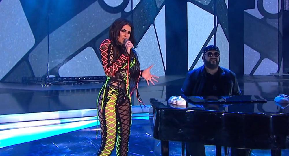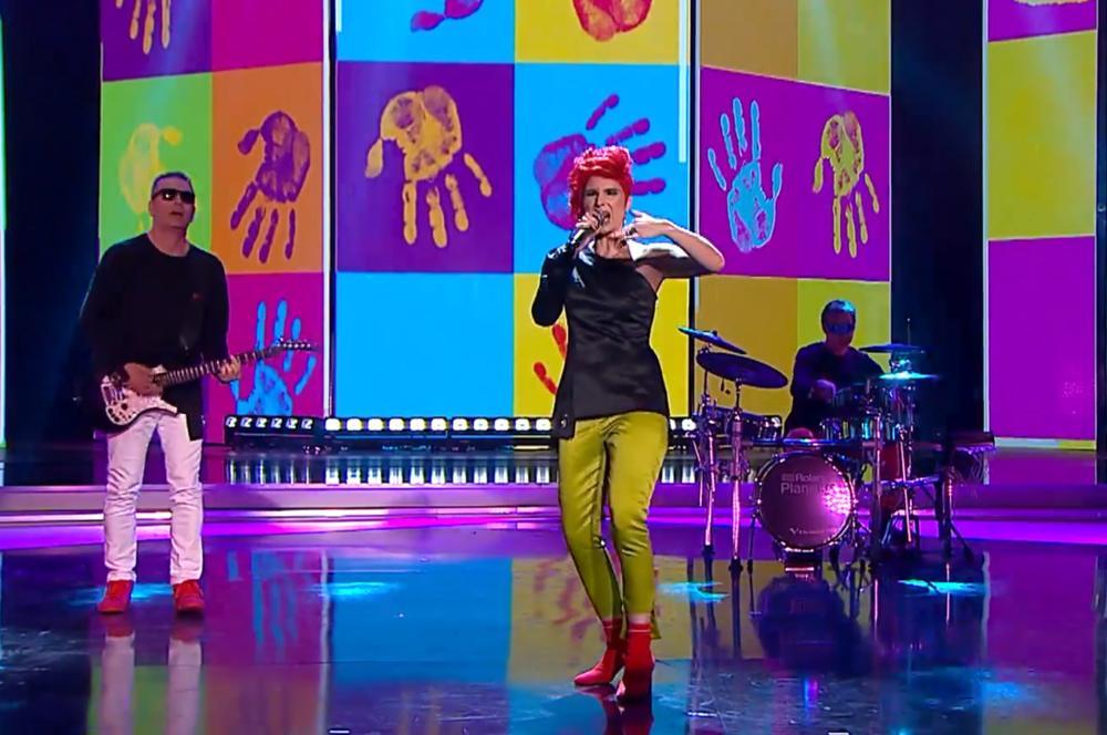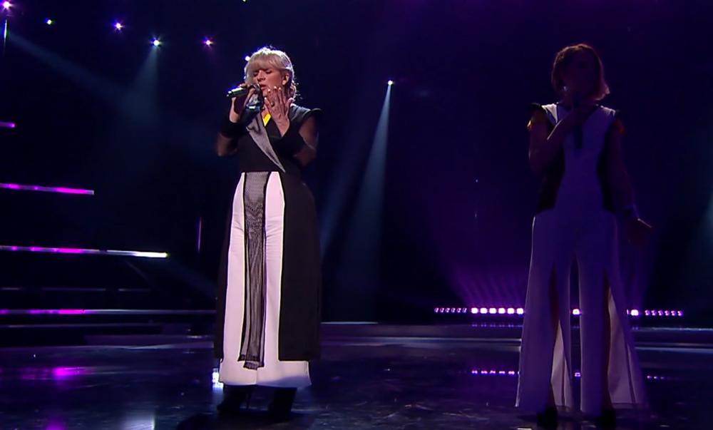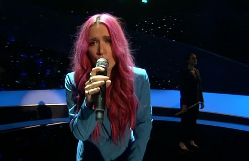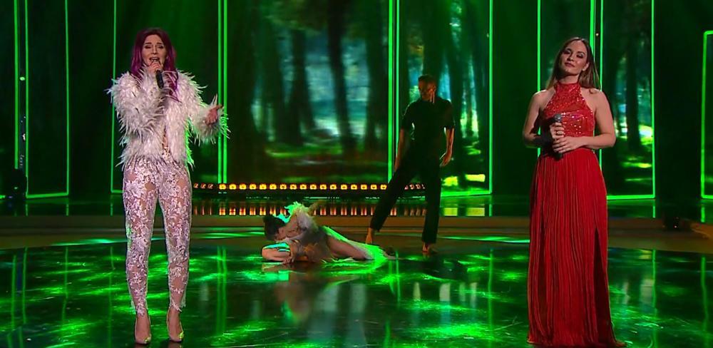 U crvenoj haljini do poda,pevačica je, zajedno sa slovenskom koleginicom Leom, zabavljala gledaoce dok se očekuje proglašenje spektakularnih 6 kandidata koji će otići direktno u finale