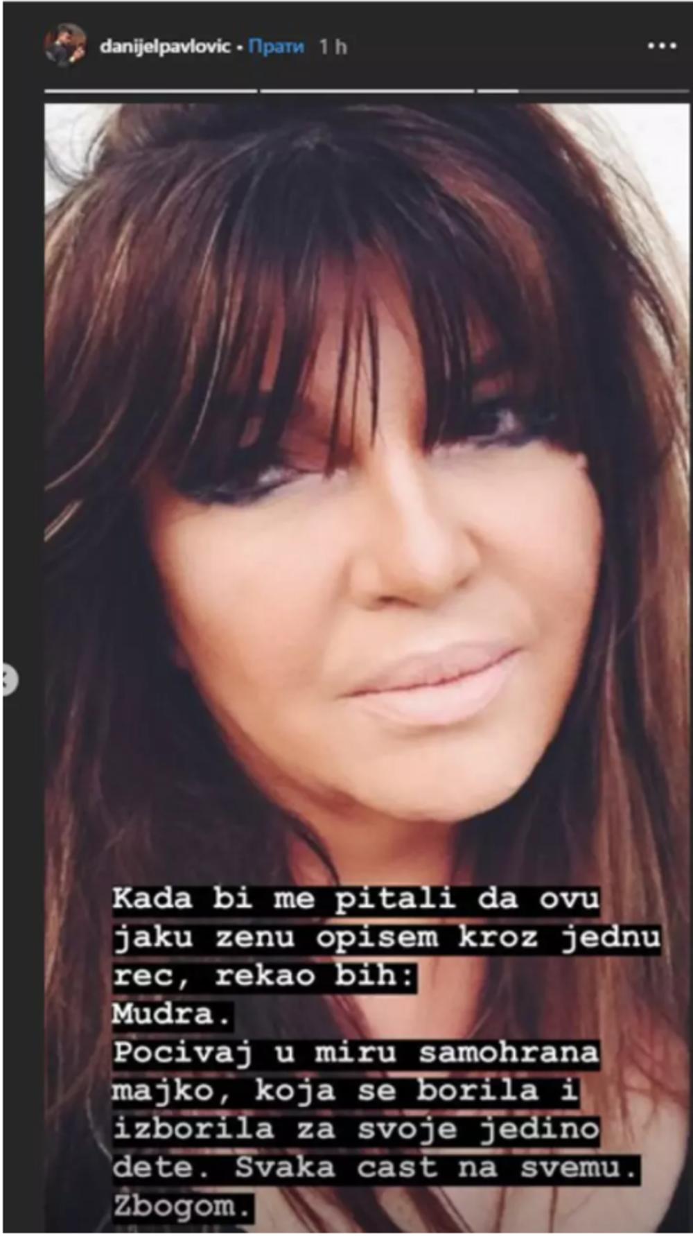 - Počivaj u miru samohrana majko, koja se borila i izborila za svoje jedino dete. Svaka čast na svemu. Zbogom - poručio je pevač Danijel Pavlović na svom Instagram profilu.