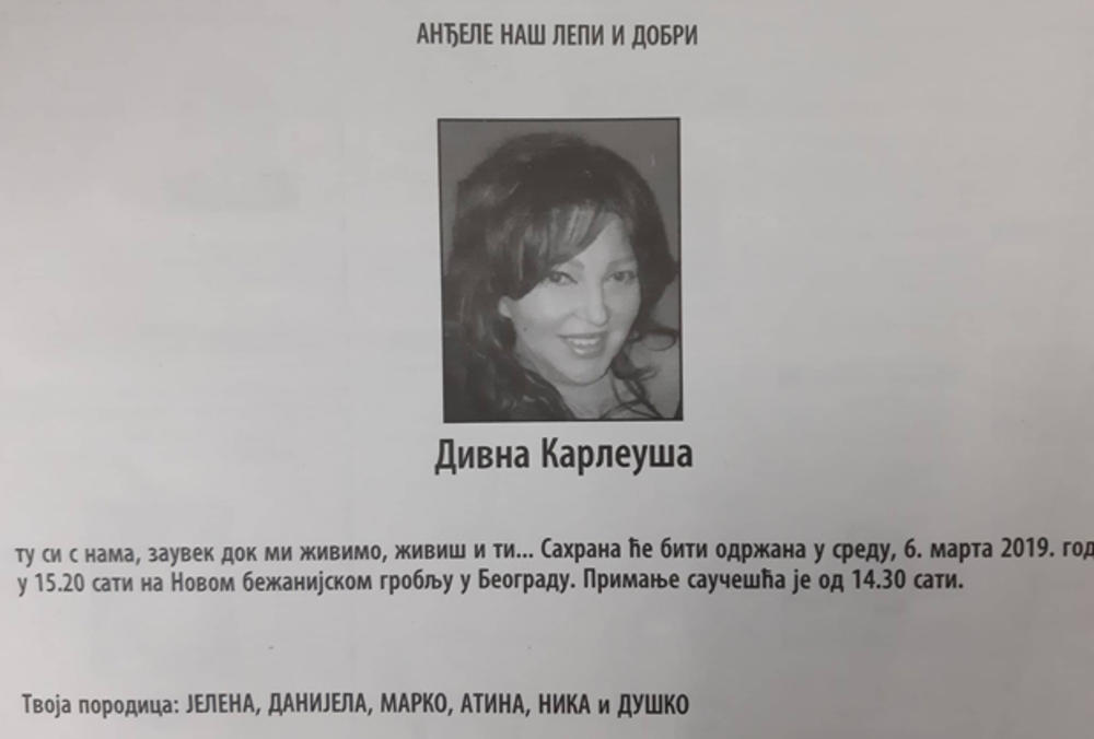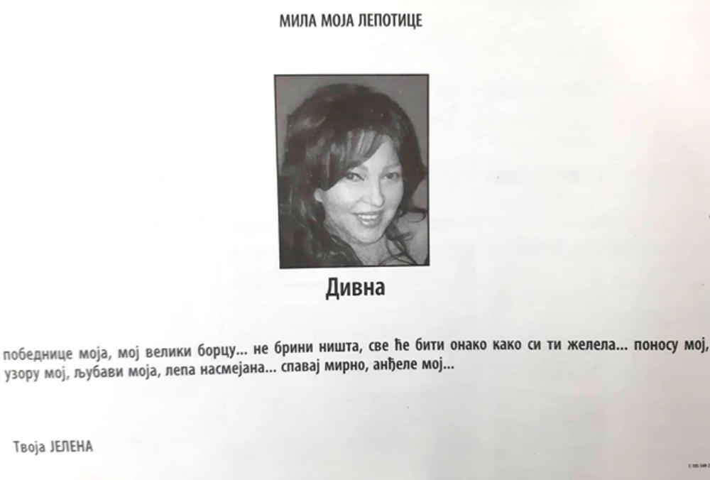 Od Divne se oprostila i cela porodica Jelena, Danijela, Marko, Atina, Nika i Duško: "Anđele naš lepi i dobri tu si s nama, zauvek dok mi živimo, živiš i ti...".