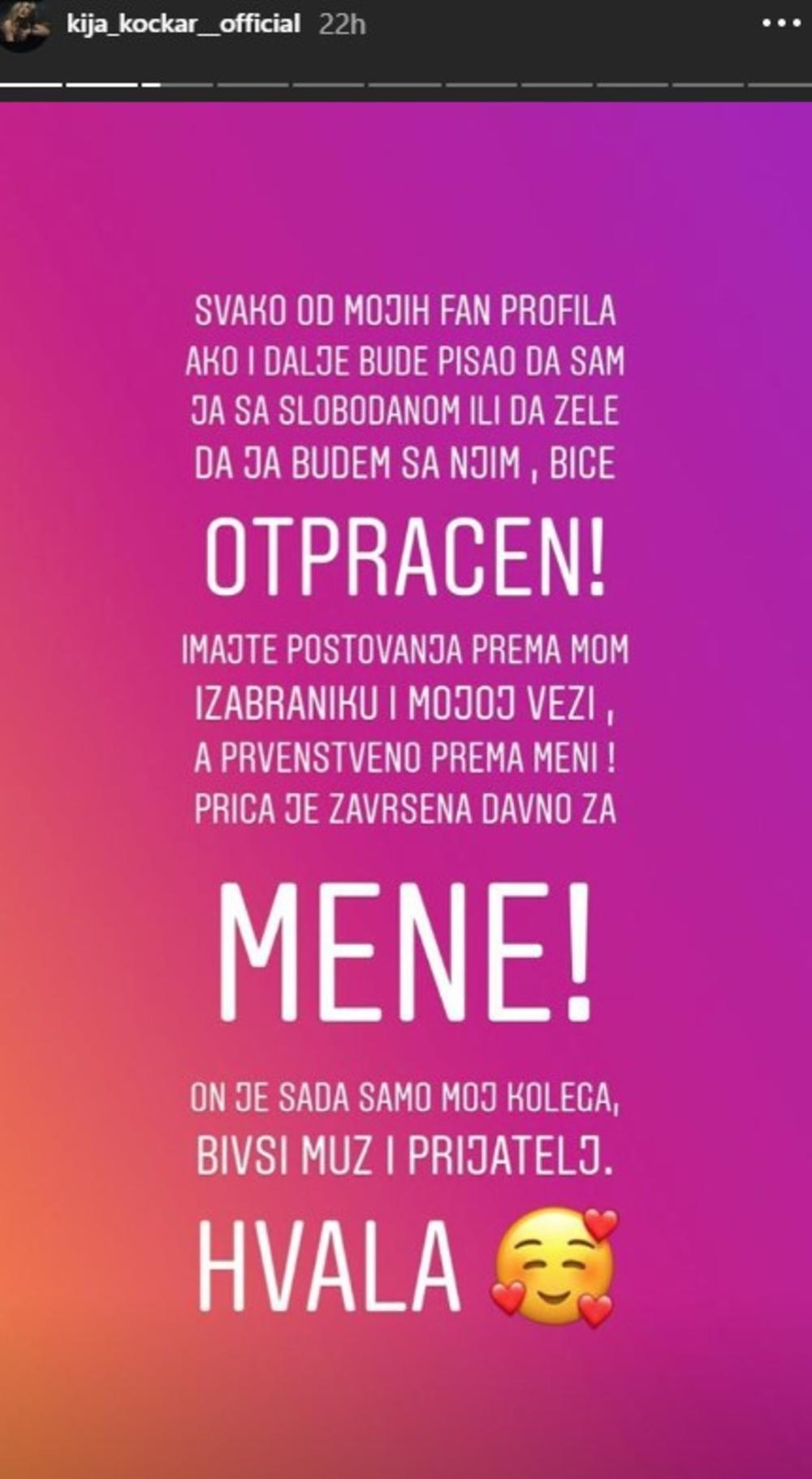 "Svako od mojih fan profila, ako i dalje bude pisao da sam ja sa Slobodanom ili da žele da budem sa njim, biće otpraćen! Imajte poštovanja prema mom izabraniku i mojoj vezi, a prvenstveno prema meni! Priča je završena odavno za mene! On je sada samo moj kolega, bivši muž i prijatelj. Hvala", napisala je Kija na svom Instagramu.
