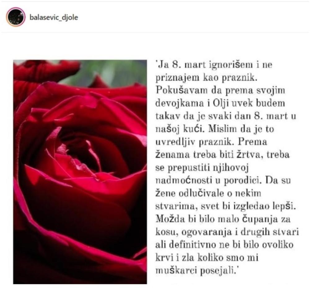 - Ja 8. mart ignorišem i ne priznajem kao praznik. Pokušavam da prema devojkana i Olji uvek budem takav da je svaki dan 8. mart u našoj kući. Mislim da je to uvredljiv praznik. Prema ženama treba biti žrtva, treba se prepustiti njenoj nadmoćnosti u porodici. Da su žene odlučivale i nekim stvarima, svet bi bio lepši. Možda bi bilo malo čupanja za kosu, ogovaranja i drugih stvari, ali definitivno ne bi bilo ovoliko krvi i zla koliko smo mi muški posejali - napisao je jednom Balašević, a njegova ćerka Beba potvrdila da se u njihovoj kući taj praznik ne slavi.