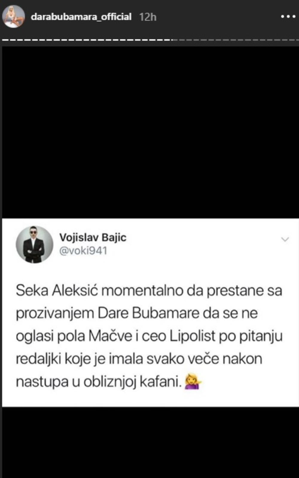 - Seka Aleksić momentalno da prestane sa prozivanjem Dare Bubamare da se ne oglasi pola Mačve i ceo Lipolist po pitanju redaljki koje je imala svako veče nakon nastupa u obližnjoj kafani - stoji u objavi koju je Dara ponosno stavila na svoj Instagram.