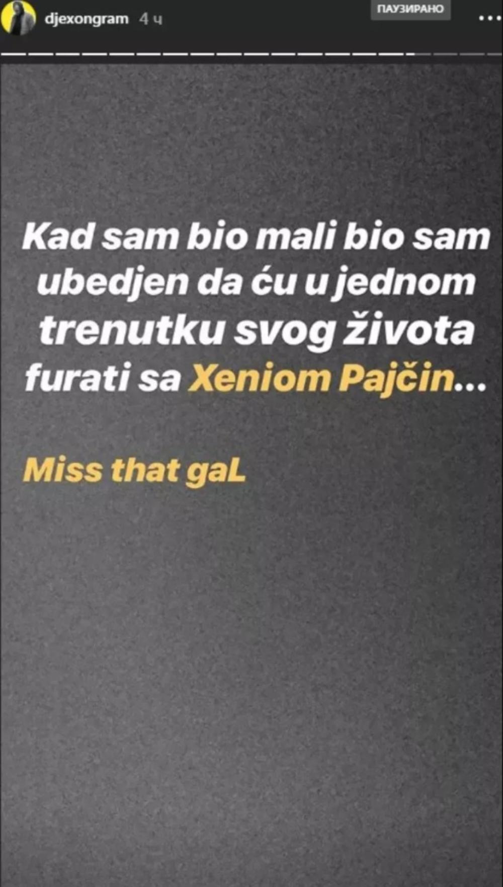 - Kad sam bio mali bio sam ubeđen da ću u jednom trenutku svog života furati sa Ksenijom Pajčin... Nedostaje mi ta devojka - napisao je reper na svom Instagramu.