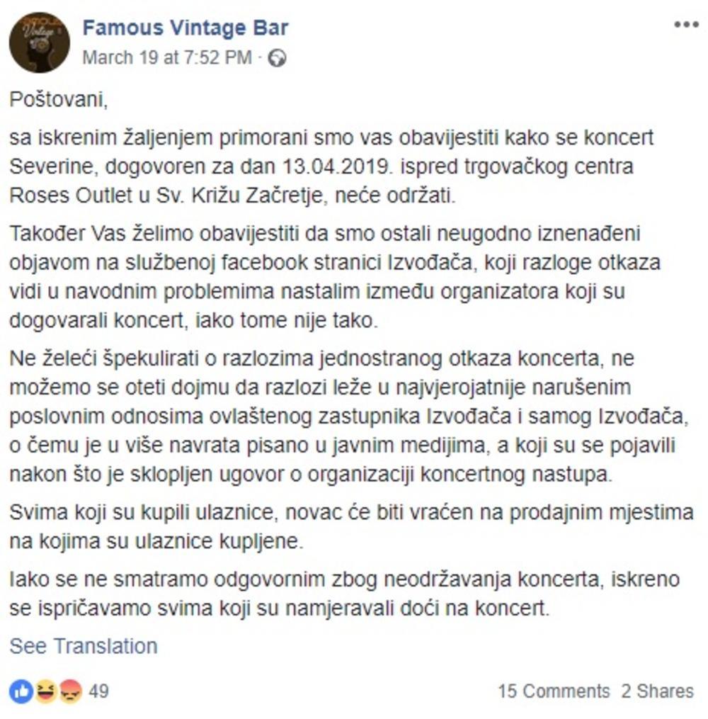 Želimo da vas obavestimo da smo ostali neprijatno iznenađeni Severininom objavom na Fejsbuk stranici, u kojoj kao razloge otkaza vidi u navodnim problemima nastalim između organizatora koji su ugovarali koncert, iako to nije tačno. Ne želeći da spekulišemo o razlozima jednostranog otkaza koncerta, ne možemo se oteti utisku da razlozi najverovatnije leže u narušenim poslovnim odnosima ovlašćenog zastupnika izvođača i samog izvođača", poručili su organizatori na Fejsbuku.