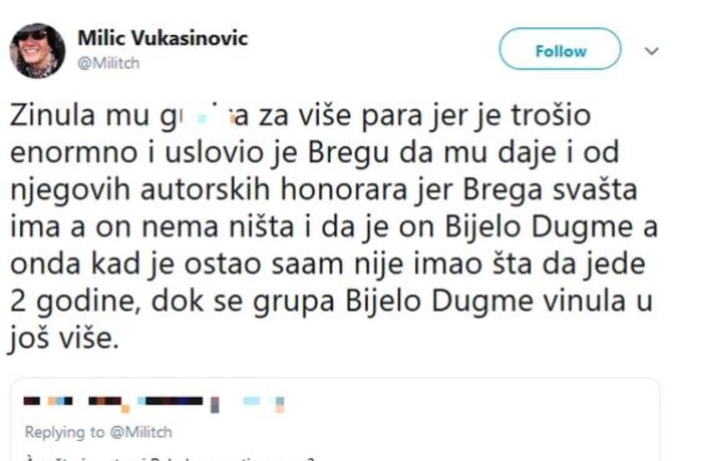 - Zinula mu gu*ica za više para jer je trošio enormno i uslovio je Bregu da mu daje i od njegovih autorskih honorara jer Brega svašta ima, a on nema ništa i da je on "Bijelo Dugme", a onda kad je ostao sam nije imao šta da jede dve godine, dok se grupa "Bijelo Dugme" vinula još više - napisao je Milić Vukašinović na svom Tviteru na pitanje fana zbog čega je Željko Bebek otišao.