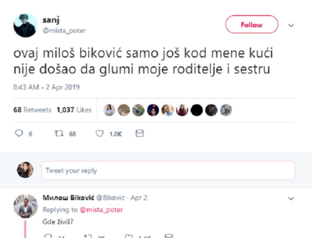 - Ovaj Miloš Biković samo još kod mene kući nije došao da glumi moje roditelje i sestru - glasi objava jednog tviteraša. Usledio odgovor glumca: - Gde živiš? - napisao je Biković, što je izazvalo veliki broj komentara na društvenim mrežama.