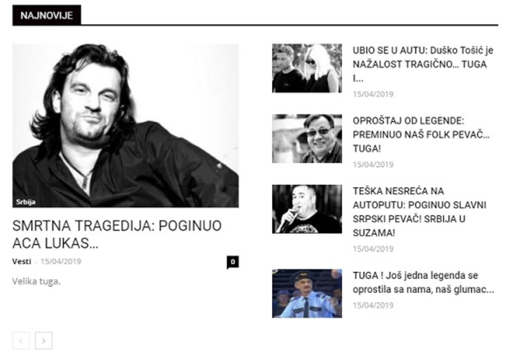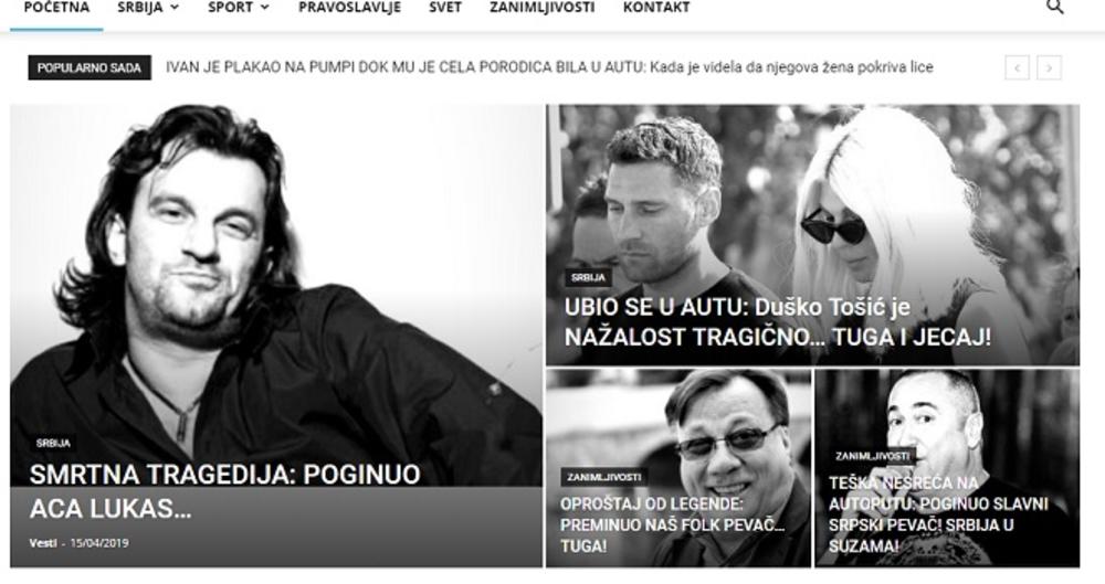 "Ubio se u autu: Duško Tošić je na žalost tragično… tuga i jecaj!", "Smrtna tragedija: Poginuo Aca Lukas…", "Oproštaj od legende: Preminuo folk pevač… Tuga!", "Teška nesreća na autoputu: Poginuo slavni srpski pevač! Srbija u suzama!" - ovo su samo neki od bizarnih naslova, kojima je preplavljen ovaj portal.