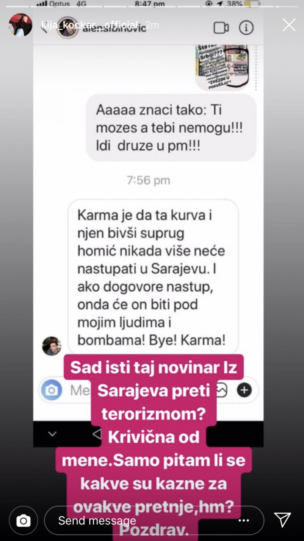 Naime, Kockar je na svom Instagram nalogu objavila da je Albinović u jednoj prepisci napisao da nju i Slobu u Sarajevu čekaju bombe kad budu došli da nastupaju.