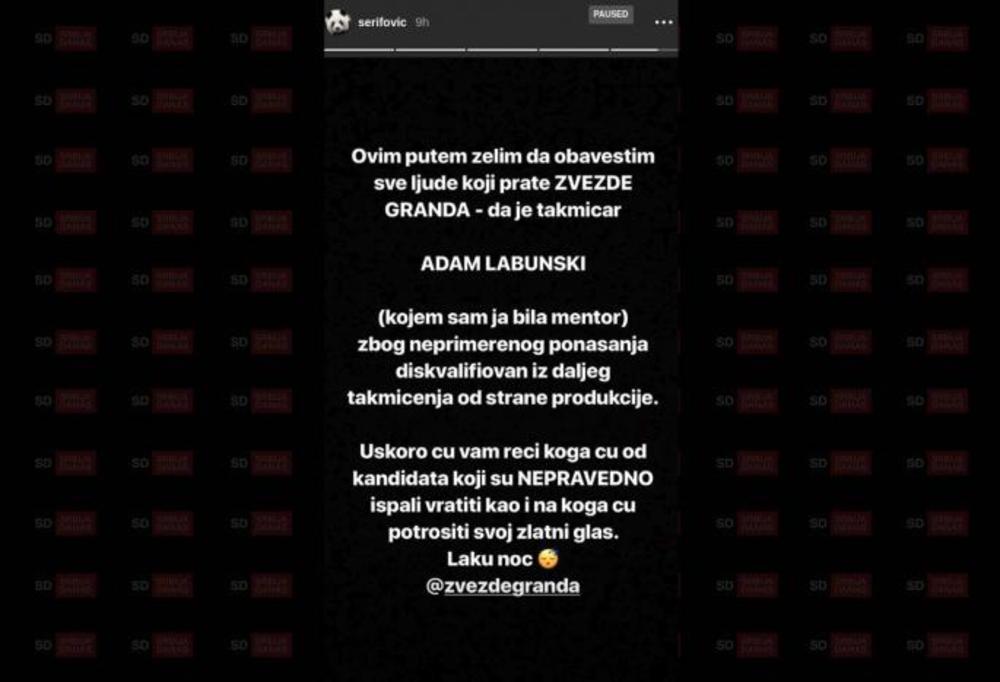 - Ovim putem želim da obavestim sve ljude koji prate Zvezde Granda, da je takmičar Adam Labunski (kojem sam ja bila mentor), zbog neprimerenog ponašanja, diskvalifikovan iz daljeg takmičenja od strane produkcije. Uskoro ću vam reći koga ću od kandidata koji su nepravedno ispali vratiti, kao i na koga ću potrošiti svoj zlatni glas - napisala je Marija.