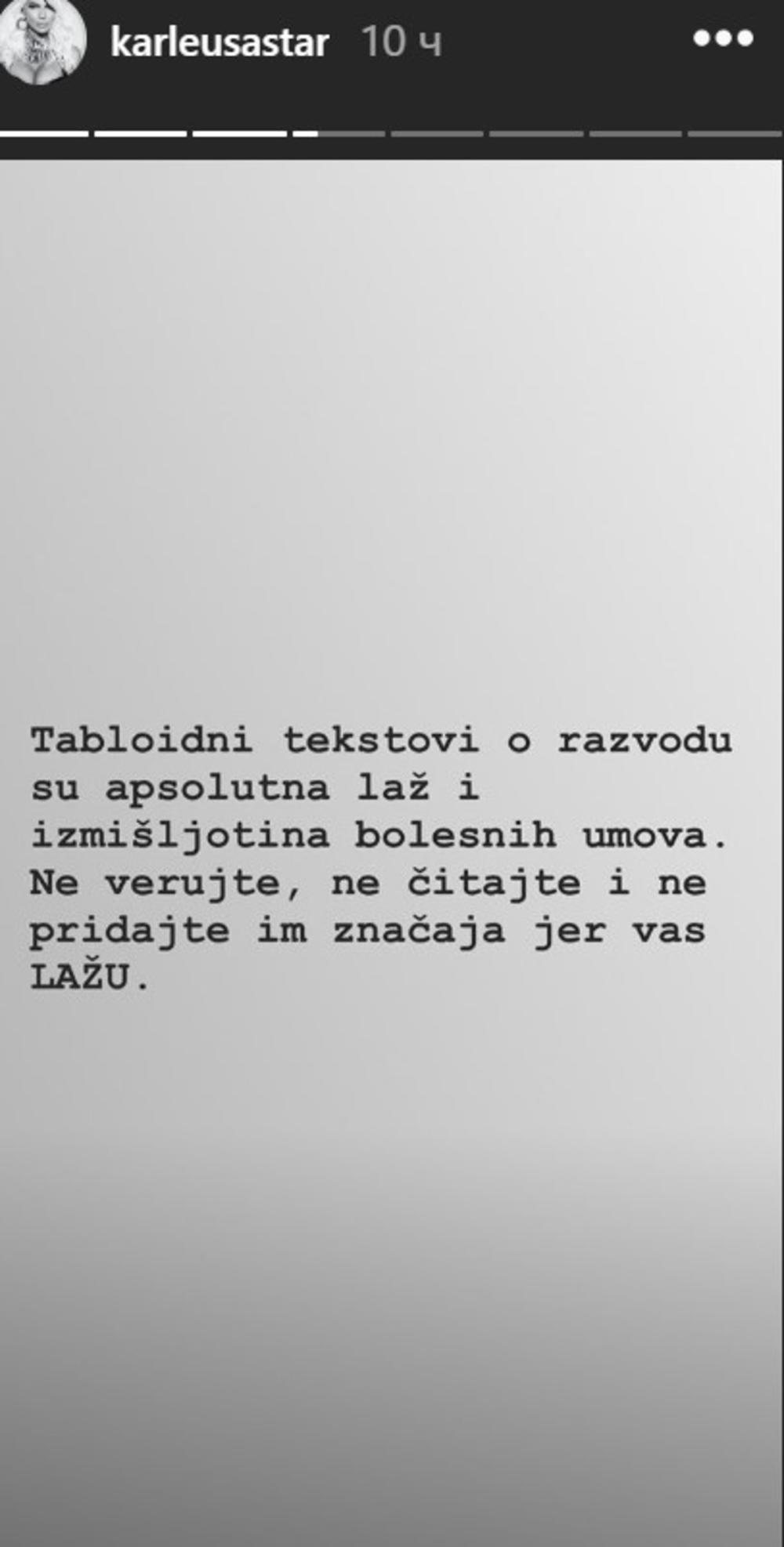 Pevačica Jelena Karleuša, posle informacije da se razvodi od Duška Tošića i da će joj fudbaler ostaviti skoro sve što su stekli, oglasila se na društvenoj mreži Instagram i napisala da je to sve laž.