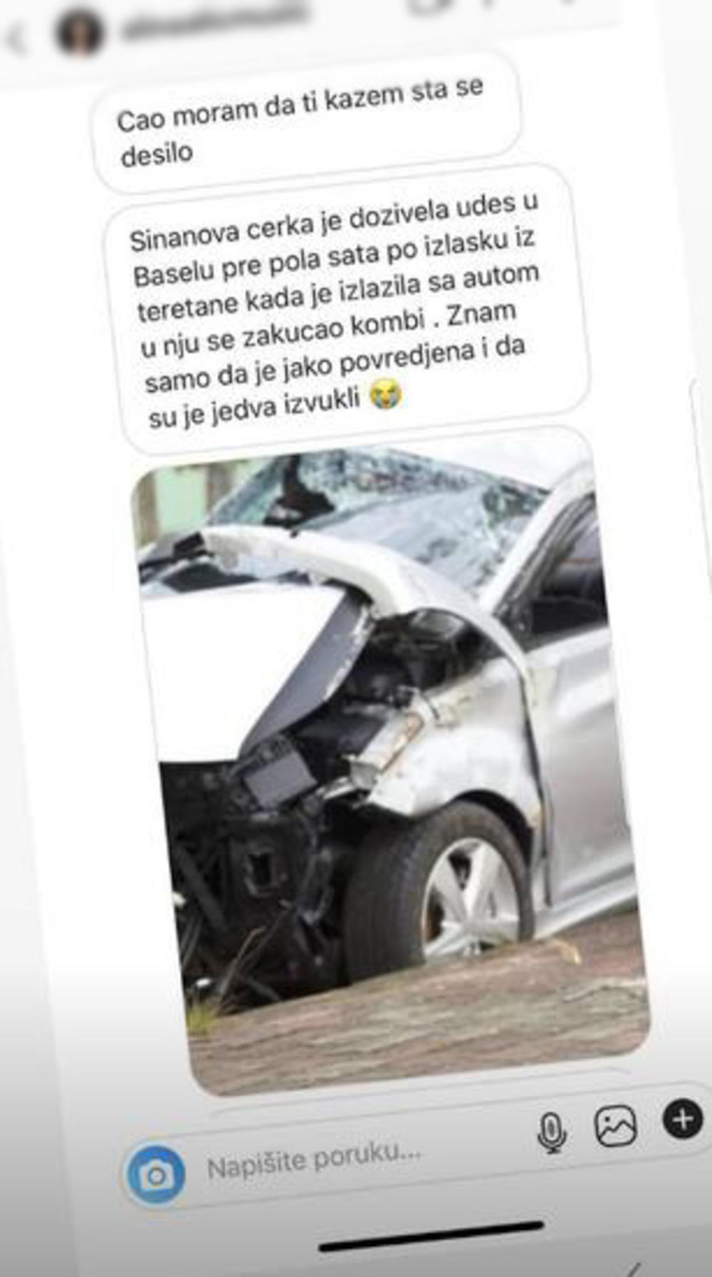 "Sinanova ćerka je doživela udes u Baselu pre pola sata po izlasku iz teretane kada je izlazila sa autom u nju se zakucao kombi. Znam samo da je jako povređena i da su je jedva izvukli", piše u poruci.