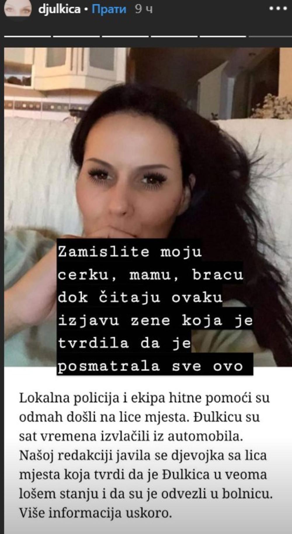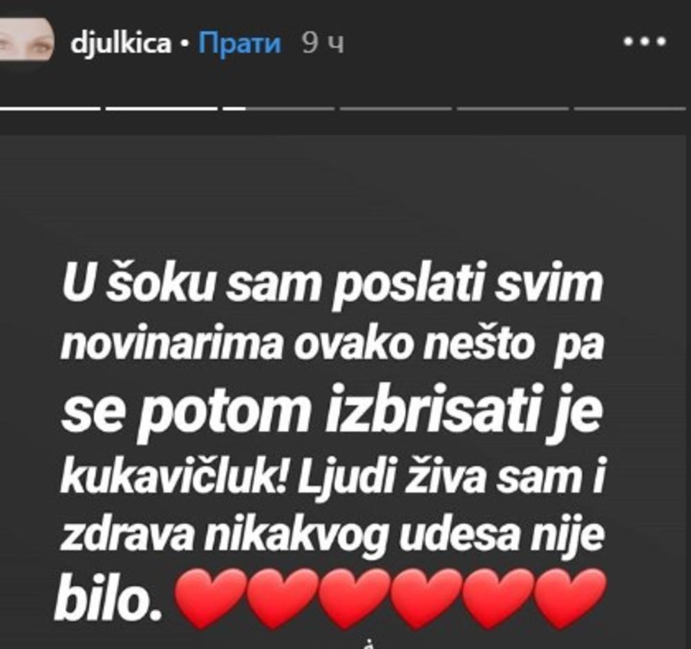 Đulkica se na Instagram storiju obratila svojim pratiocima i poručila im da je dobro i da ništa od toga nije tačno, a onda je pokazala prepisku s nepoznatom ženom koja je tvrdila da je videla saobraćajku u kojoj je Sinanova ćerka teško povređena.