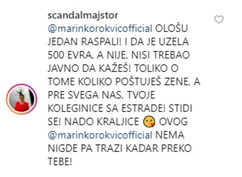 - MARINKO, OLOŠU JEDAN RASPALI! I DA JE UZELA 500 EVRA, A NIJE, NISI TREBAO JAVNO DA KAŽEŠ! TOLIKO O TOME KOLIKO POŠTUJEŠ ZENE, A PRE SVEGA NAS, TVOJE KOLEGINICE SA ESTRADE! STIDI SE! NADO KRALJICE, OVOG MARINKA NEMA NIGDE PA TRAZI KADAR PREKO TEBE!