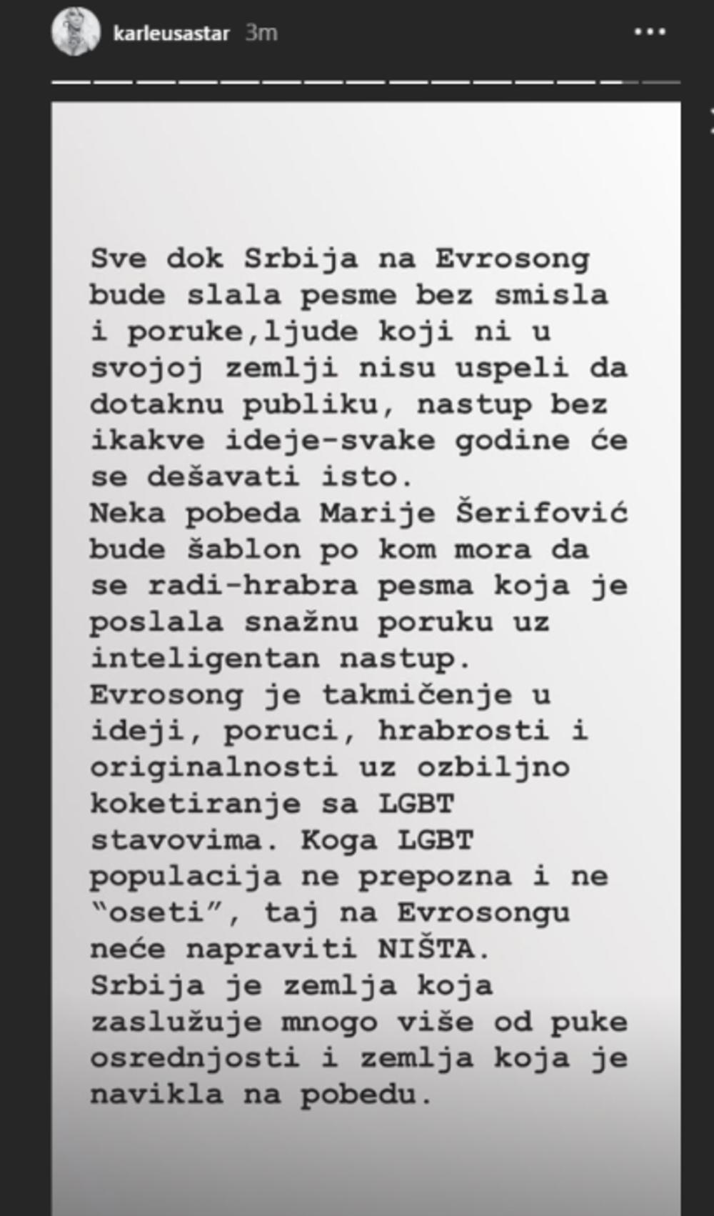 Ona je na svom Instagram nalogu objavila status i zapitala se dokle ćemo slati "prosečne izvođače" i pesme na ovo takmičenje i zbog čega nismo izvukli nikakve pouke iz pobede Marije Šerifović. Bez imalo blama, Karleuša je na svom instagramu napisala ovo: