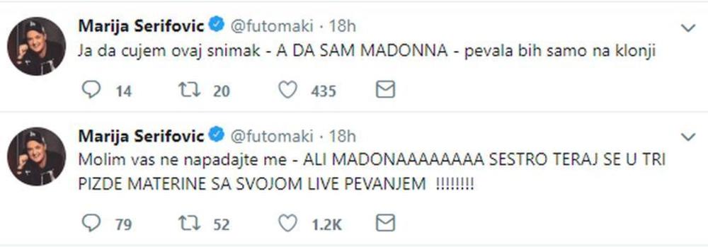 Molim vas ne napadajte me - Ali, Madona, sestro, teraj se u tri pi*de materina sa svojim live pevanjem. Ja da čujem ovaj snimak - a da sam Madona - pevala bih samo na klonji - napisala je Marija Šerifović na Tviteru.