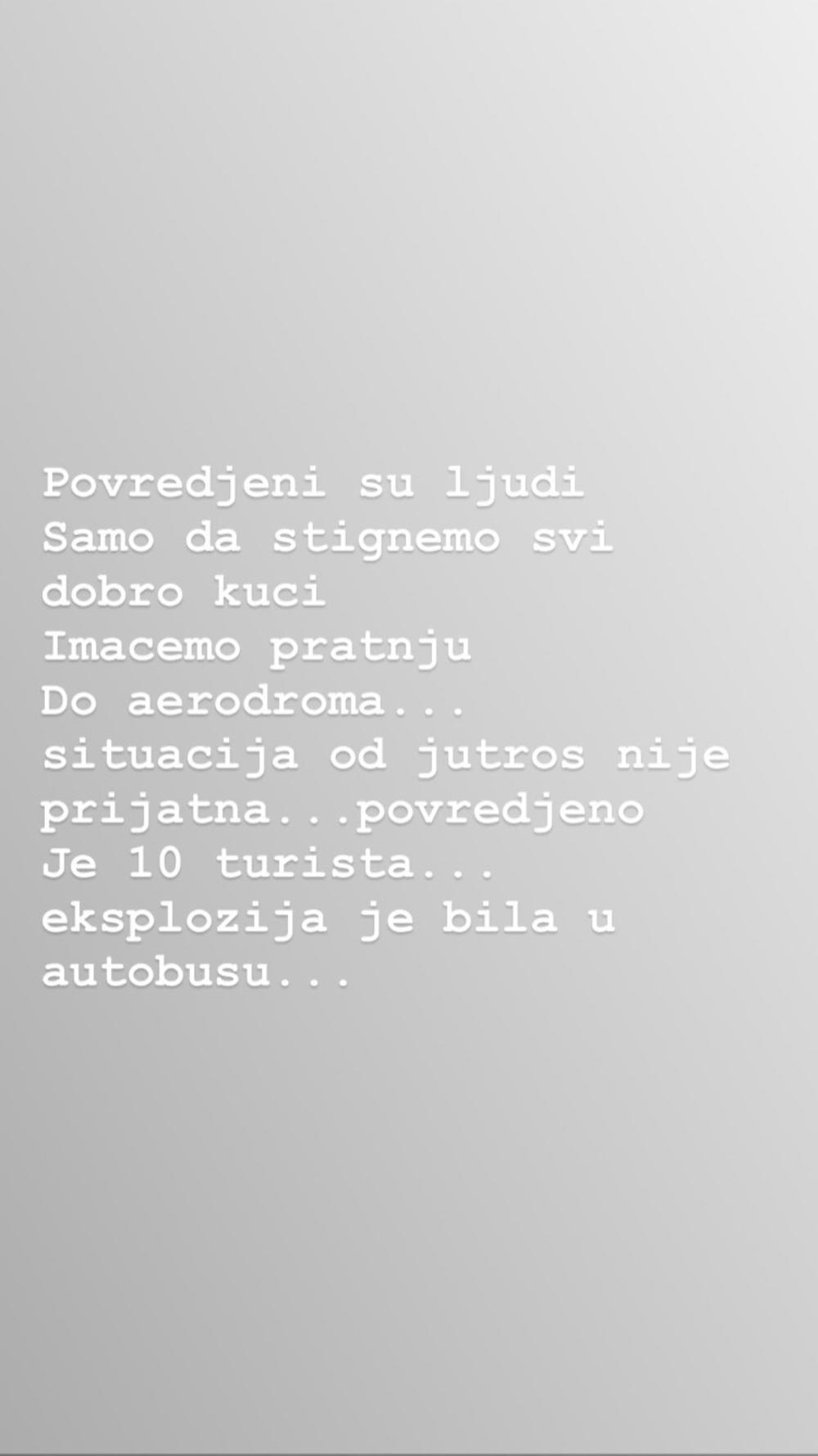 – Povređeni su ljudi. Samo da stignemo svi dobro kući. Imaćemo pratnju do aerodroma… situacija od jutros nije prijatna… povređeno je deset turista… eksplozija je bila u autobusu… – navela je Vladana na „Instagramu“.