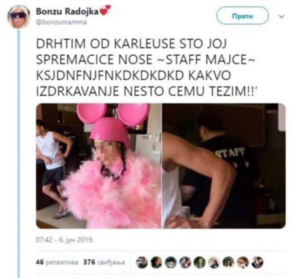 - Drhtim od Karleuše što joj spremačice nose 'staff' majice. Kakvo izd*kavanje, nešto čemu težim - napisao je jedan od tviteraša.