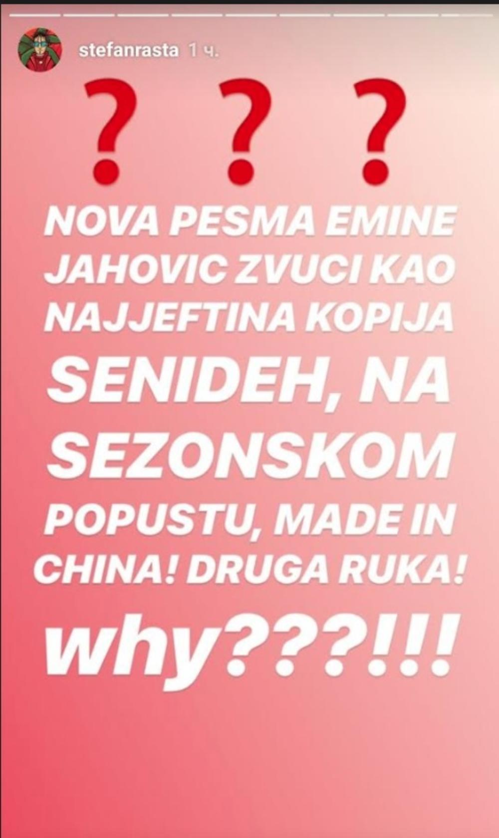 - Nova pesma Emine Jahović zvuči kao najjeftinija kopija Senidah, na sezonskom popustu, made in China! Druga ruka" Why??? - napisao je reper.