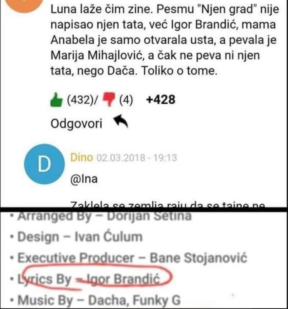 - Luna laže čim zine. Pesmu "Njen grad" nije napisao njen tata, već Igor Brandić, mama Anabela je samo otvara usta, a pevala je Marija Mihajlović, a čak ne peva ni njen tata, nego Dača. Toliko o tome. - stoji u komentaru, nakon čega su je mnogi optužili da je patološki lažov.