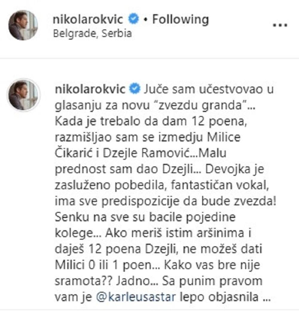 - Juče sam učestvovao u glasanju za novu “Zvezdu Granda”. Kada je trebalo da dam 12 poena, razmišljao sam između Milice Čikarić i Džejle Ramović... Malu prednost sam dao Džejli... Devojka je zasluženo pobedila, fantastičan vokal, ima sve predispozicije da bude zvezda! Senku na sve su bacile pojedine kolege... Ako meriš istim aršinima i daješ 12 poena Džejli, ne možeš dati Milici 0 ili 1 poen... Kako vas bre nije sramota?? Jadno... Svim takmičarima želim mnogo sreće i uspeha i nemojte biti kao pojedini - napisao je u svojoj objavi na Instagramu Rokvić.