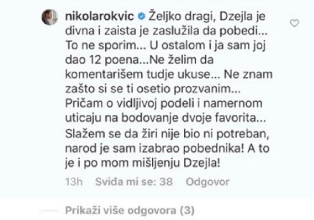- Željko dragi, Džejla je divna i zaista je zaslužila da pobedi... To ne sporim... U ostalom i ja sam joj dao 12 poena...Ne želim da komentarišem tuđe ukuse... Ne znam zašto si se ti osetio prozvanim... Pričam o vidljivoj podeli i namernom uticaju na bodovanje dvoje favorita... Slažem se da žiri nije bio ni potreban, narod je sam izabrao pobednika! A to je i po mom mišljenju Džejla!