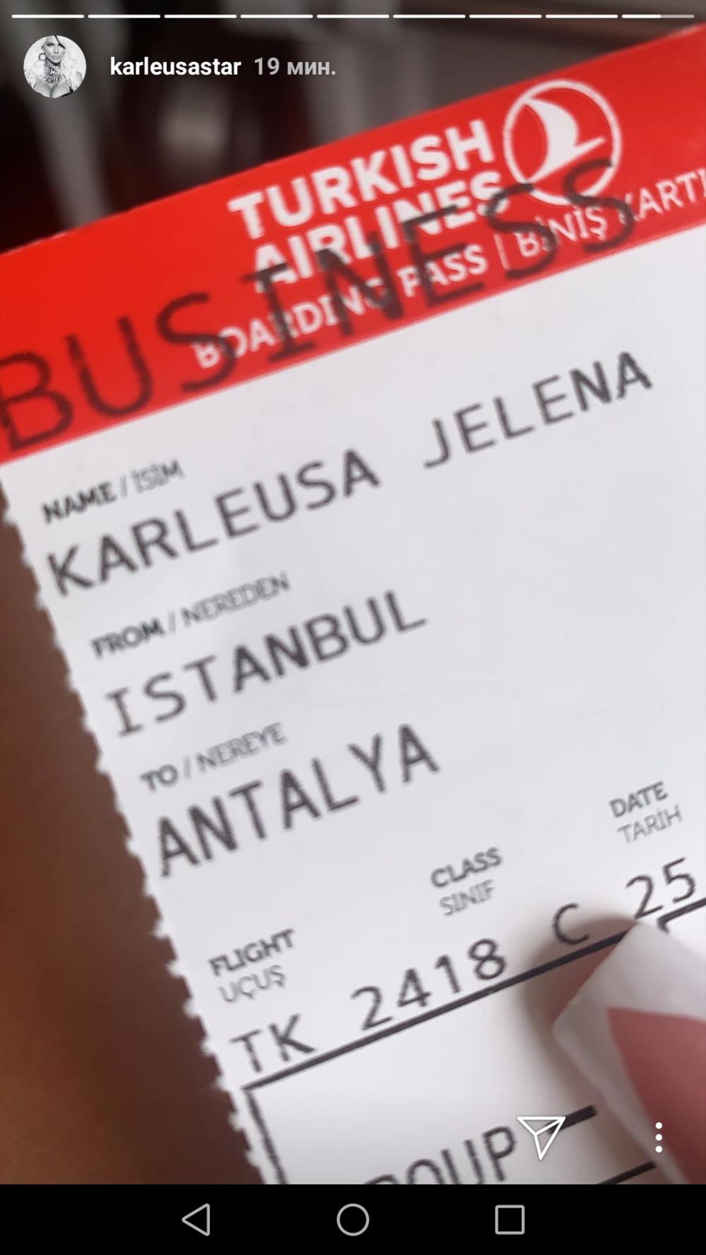 Karleuša je danas objavila na svom Instagram nalogu fotografiju avionske karte i tako otkrila da danas putuje za Istanbul.