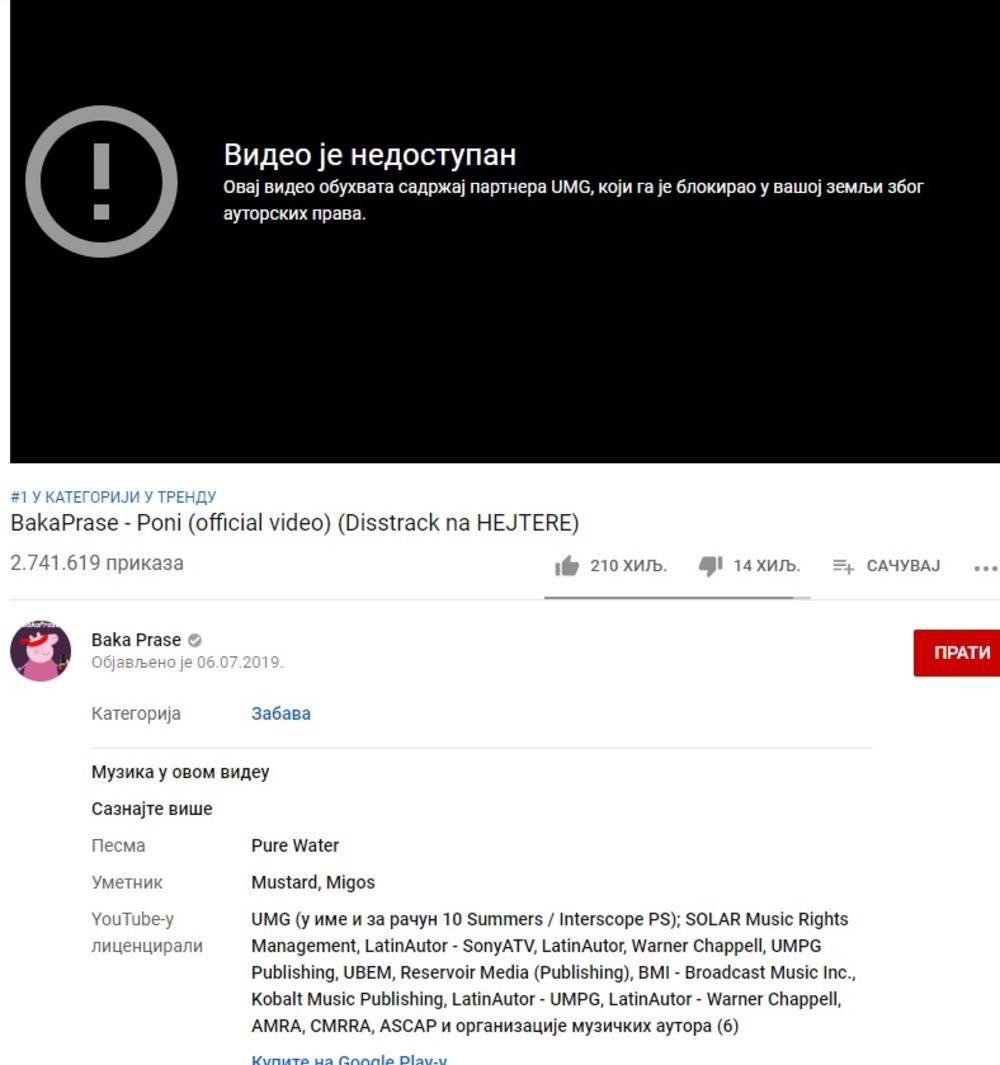Jutjuber Bogdan Ilić, poznatiji kao Baka Prase, pre nekoliko dana objavio je singl koji je već sakupio blizu tri miliona pregleda i bio prvi u trendingu po slušanosti. Pesma i spot su ukinuti, odnosno nedostupni, zbog toga što su su korišćeni delovi pesme "Pure Water" pevača Migosa i di-džeja Mastarda. Tako je pesma blokirana zbog autorskih prava, stoji na Jutjubu.